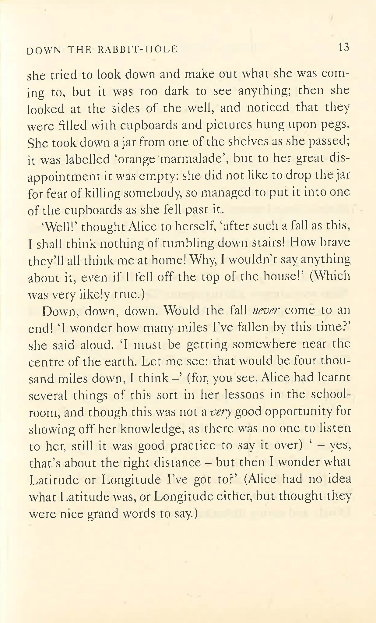 Alice is one of the most beloved characters of English writing. A bright and inquisitive child, one boring summer afternoon she follows a white rabbit down a rabbit-hole. At the bottom she finds herself in a bizarre world full of strange creatures, and attends a very strange tea party and croquet match. This immensely witty and unique story mixes satire and puzzles, comedy and anxiety, to provide an astute depiction of the experience of childhood.