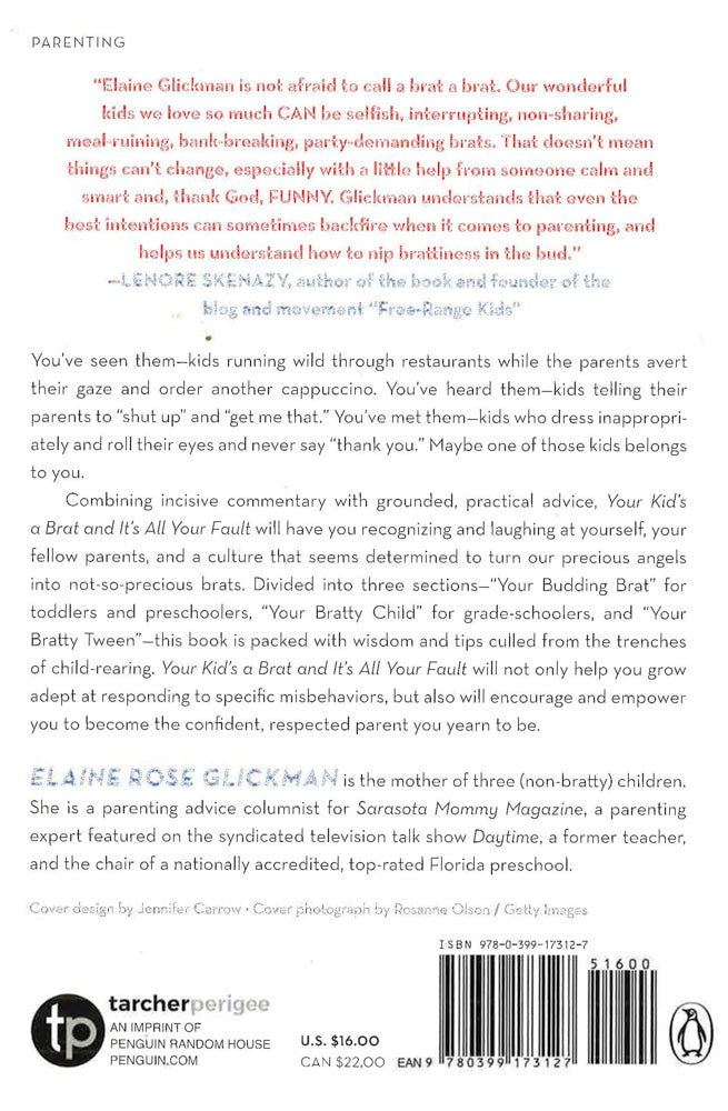 In this wise and hilarious parenting book, Elaine Rose Glickman tells parents that--when it comes to their bratty kids--the buck stops with them! You've seen them--kids running wild through restaurants while the parents avert their gaze and order another cappuccino. You've heard them--kids telling their parents to "shut up" and "get me that." You've met them--kids who dress inappropriately and roll their eyes and never say "thank you." Maybe one of those kids belongs to you.