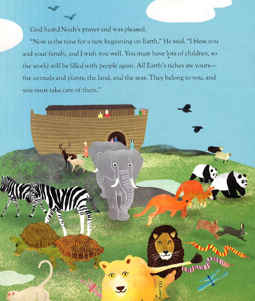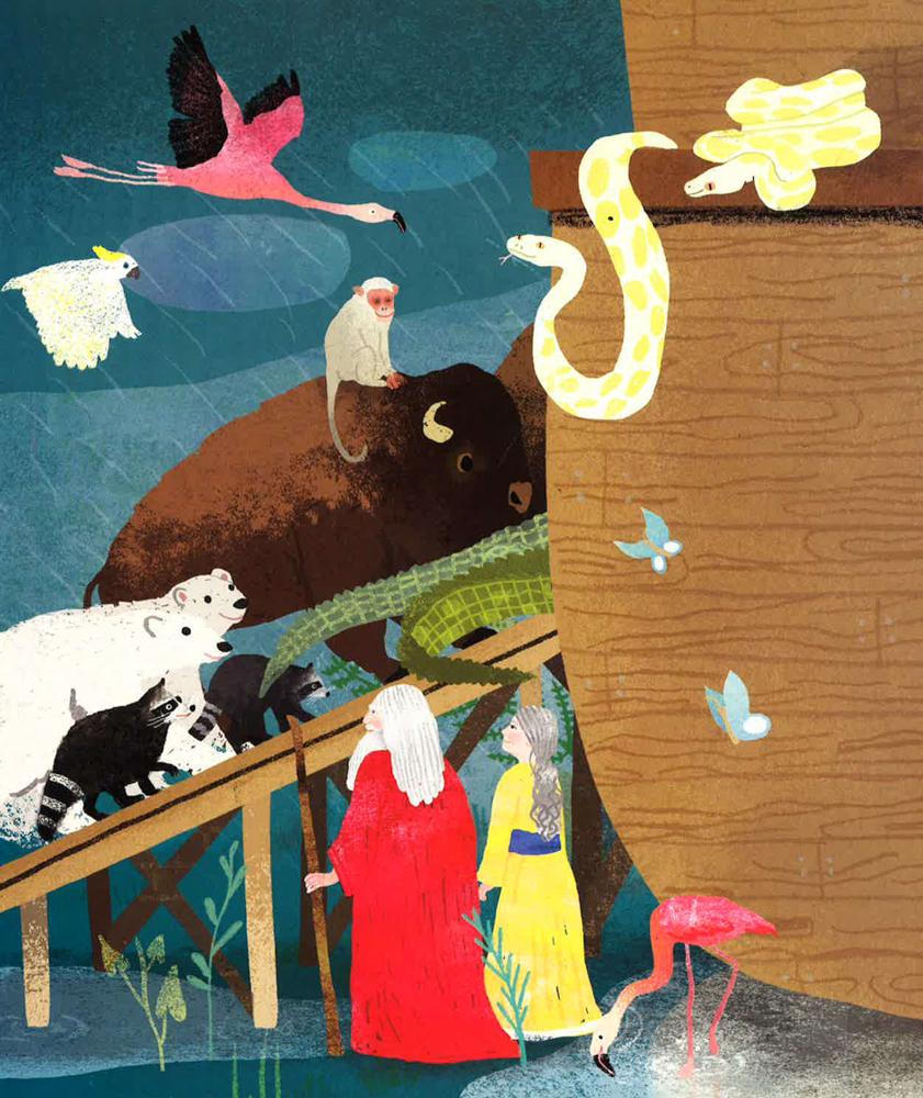 When God warns Noah that a flood is coming, Noah builds a huge ark and gathers two of every animal in the world.
