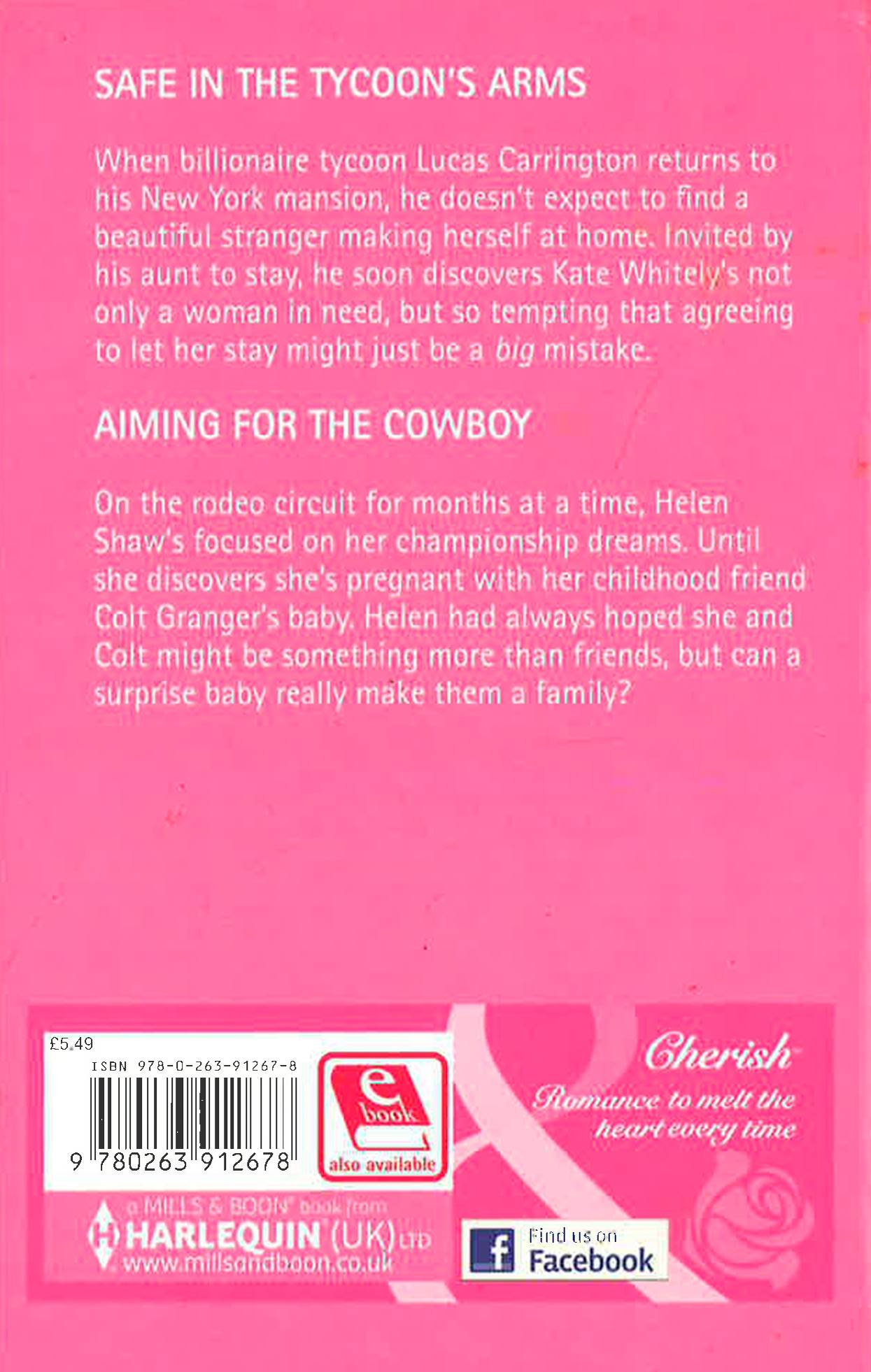 Safe in the Tycoon's Arms When billionaire tycoon Lucas Carrington returns to his New York mansion, he doesn't expect to find a beautiful stranger making herself at home. Invited by his aunt to stay, he soon discovers Kate Whitely's not only a woman in need, but so tempting that agreeing to let her stay might just be a big mistake. Aiming for the Cowboy On the rodeo circuit for months at a time, Helen Shaw's focused on her championship dreams. Until she discovers she's pregnant with her childhood friend Colt Granger's baby. Helen had always hoped she and Colt might be something more than friends, but can a surprise baby really make them a family?