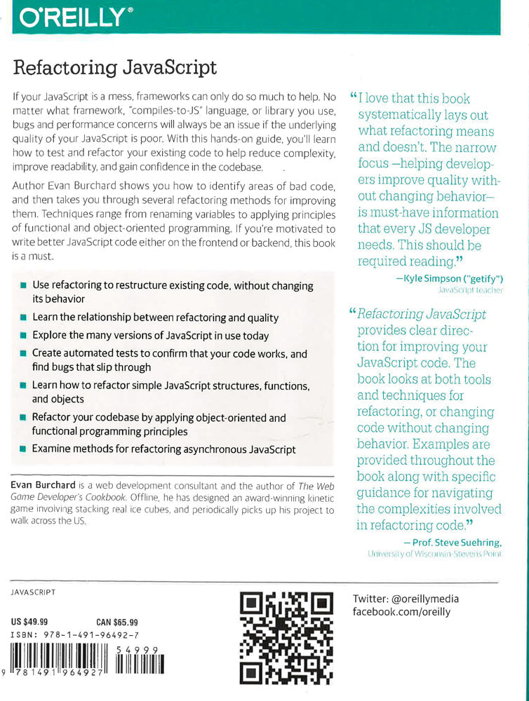 How often do you hear people say things like this? "Our JavaScript is a mess, but we're thinking about using [framework of the month]." Like it or not, JavaScript is not going away. No matter what framework or "compiles-to-js" language or library you use, bugs and performance concerns will always be an issue if the underlying quality of your JavaScript is poor. Rewrites, including porting to the framework of the month, are terribly expensive and unpredictable. The bugs won't magically go away, and can happily reproduce themselves in a new context. To complicate things further, features will get dropped, at least temporarily. The other popular method of fixing your JS is playing "JavaScript Jenga," where each developer slowly and carefully takes their best guess at how the out-of-control system can be altered to allow for new features, hoping that this doesn't bring the whole stack of blocks down. This book provides clear guidance on how best to avoid these pathological approaches to writing JavaScript: Recognize you have a problem with your JavaScript quality. Forgive the code you have now, and the developers who made it. Learn repeatable, memorable, and time-saving refactoring techniques. Apply these techniques as you work, fixing things along the way. Internalize these techniques, and avoid writing as much problematic code to begin with. Bad code doesn't have to stay that way. And making it better doesn't have to be intimidating or unreasonably expensive.