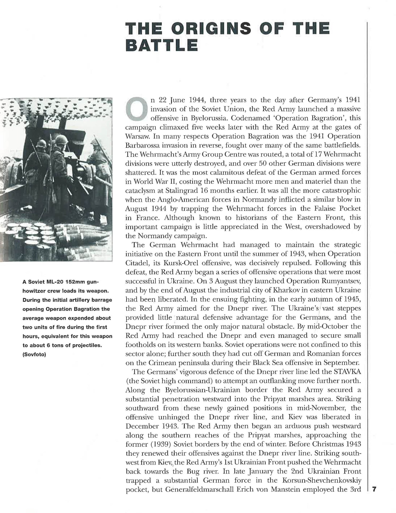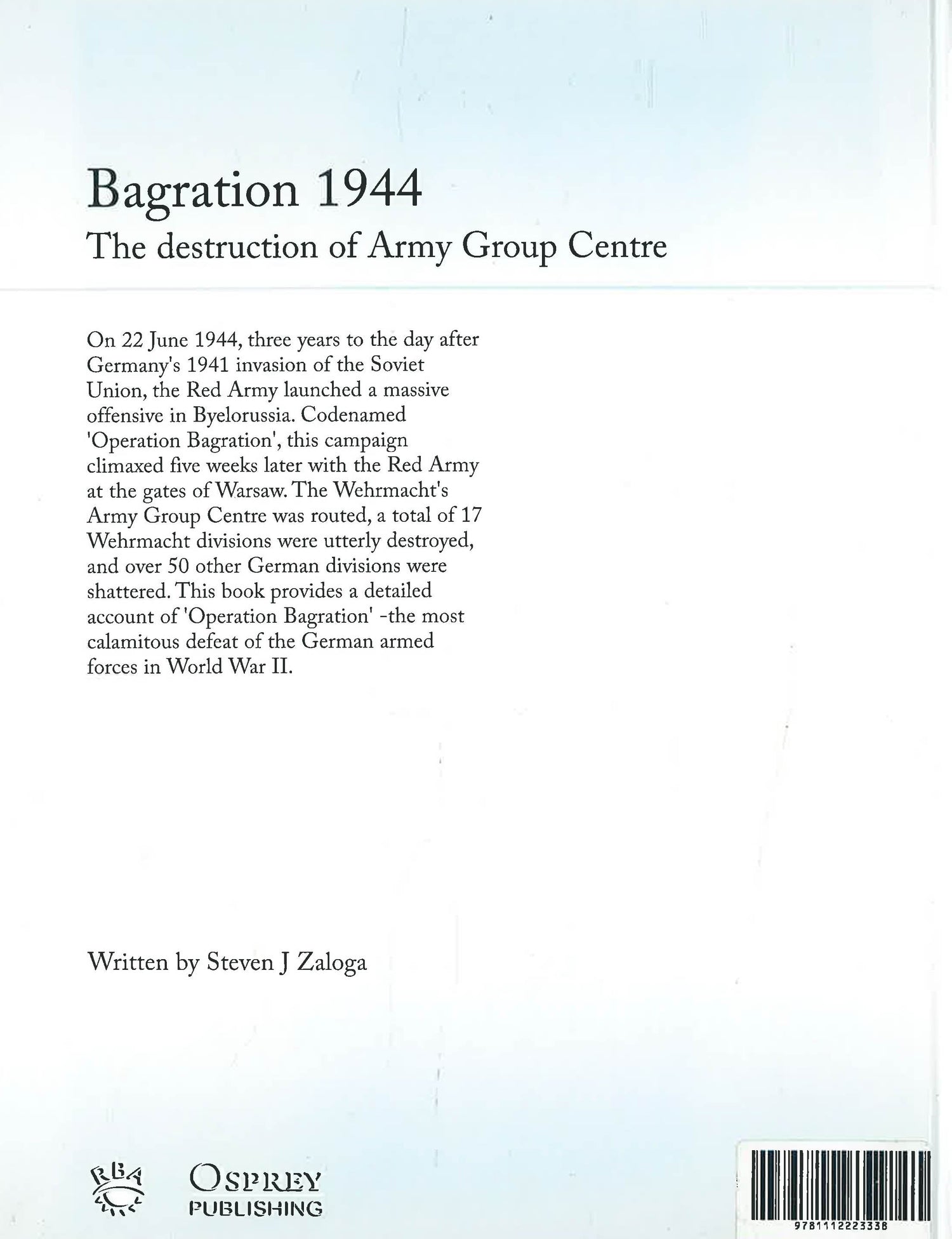 Osprey's overview of the most calamitous defeat of the German armed forces in World War II (1939-1945). On 22 June 1944, three years to the day after Germany's 1941 invasion of the Soviet Union, the Red Army launched a massive offensive in Byelorussia. Codenamed 'Operation Bagration', this campaign climaxed five weeks later with the Red Army at the gates of Warsaw. The Wehrmacht's Army Group Centre was routed, a total of 17 Wehrmacht divisions were utterly destroyed, and over 50 other German divisions were shattered.