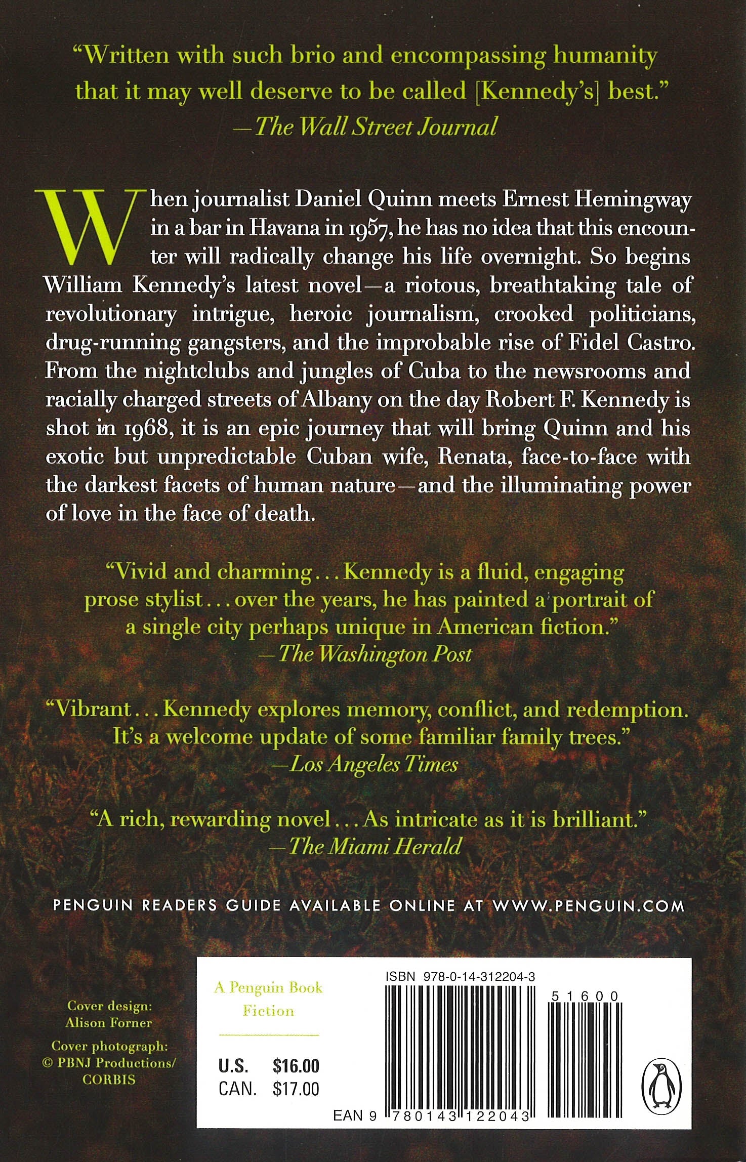 So begins William Kennedy's latest novel--a tale of revolutionary intrigue, heroic journalism, crooked politicians, drug-running gangsters, Albany race riots, and the improbable rise of Fidel Castro. Quinn's epic journey carries him through the nightclubs and jungles of Cuba and into the newsrooms and racially charged streets of Albany on the day Robert Kennedy is fatally shot in 1968. The odyssey brings Quinn, and his exotic but unpredictable Cuban wife, Renata, a debutante revolutionary, face-to-face with the darkest facets of human nature and illuminates the power of love in the presence of death.