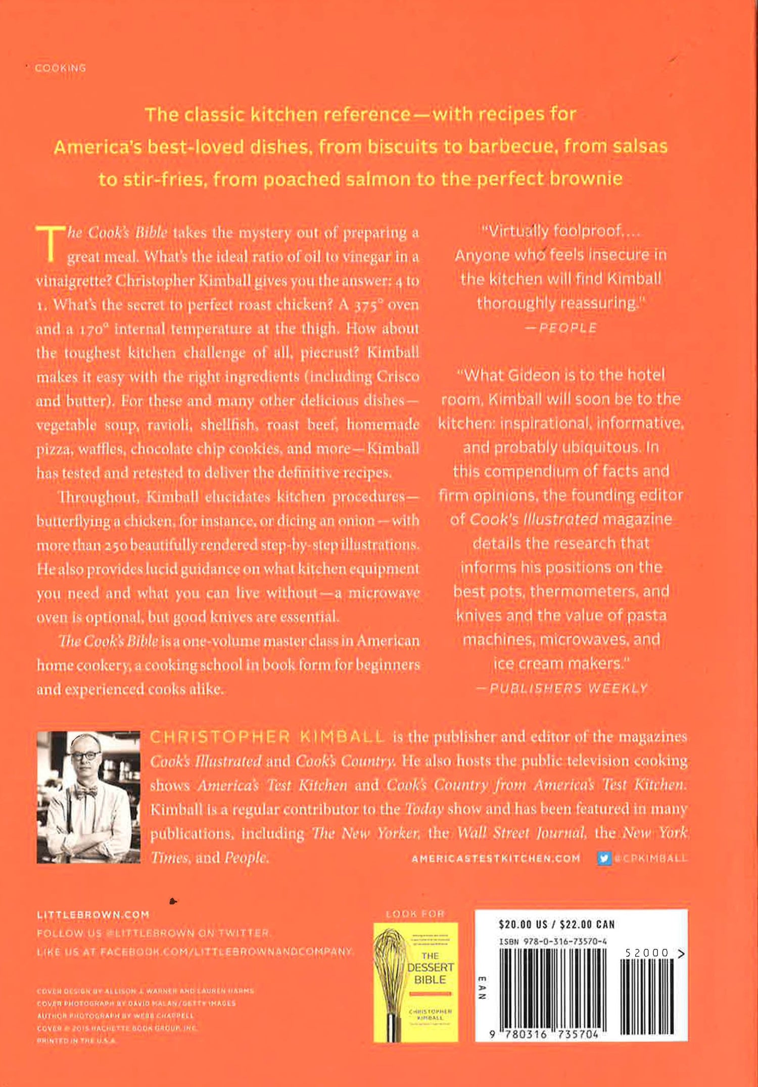 As the founder, publisher, and editor of Cook's Illustrated magazine, Kimball has perfected an invaluable way of writing about food: take a classic dish, meticulously test all possible variations, and then present the recipes proven best. The Cook's Bible takes the mystery out of preparing a great meal. In addition to numerous master recipes, Kimball serves up a generous helping of appealing variations - nearly 450 recipes in all. Throughout, Kimball elucidates kitchen procedures with more than 250 beautifully rendered step-by-step illustrations. And he also provides lucid guidance on what kitchen equipment you need and what you can live without. From recipes to techniques to equipment, here is a one-volume master class in American home cookery, a cooking school in print for beginners and experienced cooks alike.