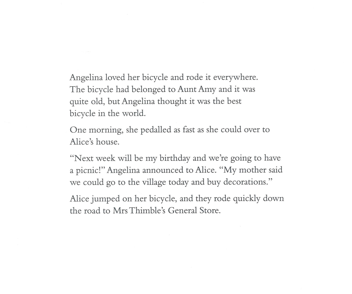 It's Angelina's birthday and there's going to be a party. But when Angelina breaks her bike while racing her best friend, Alice, she thinks the day is ruined. There is, however, a solution to the problem and Angelina's birthday turns out to be the happiest - and the most surprising - one ever.