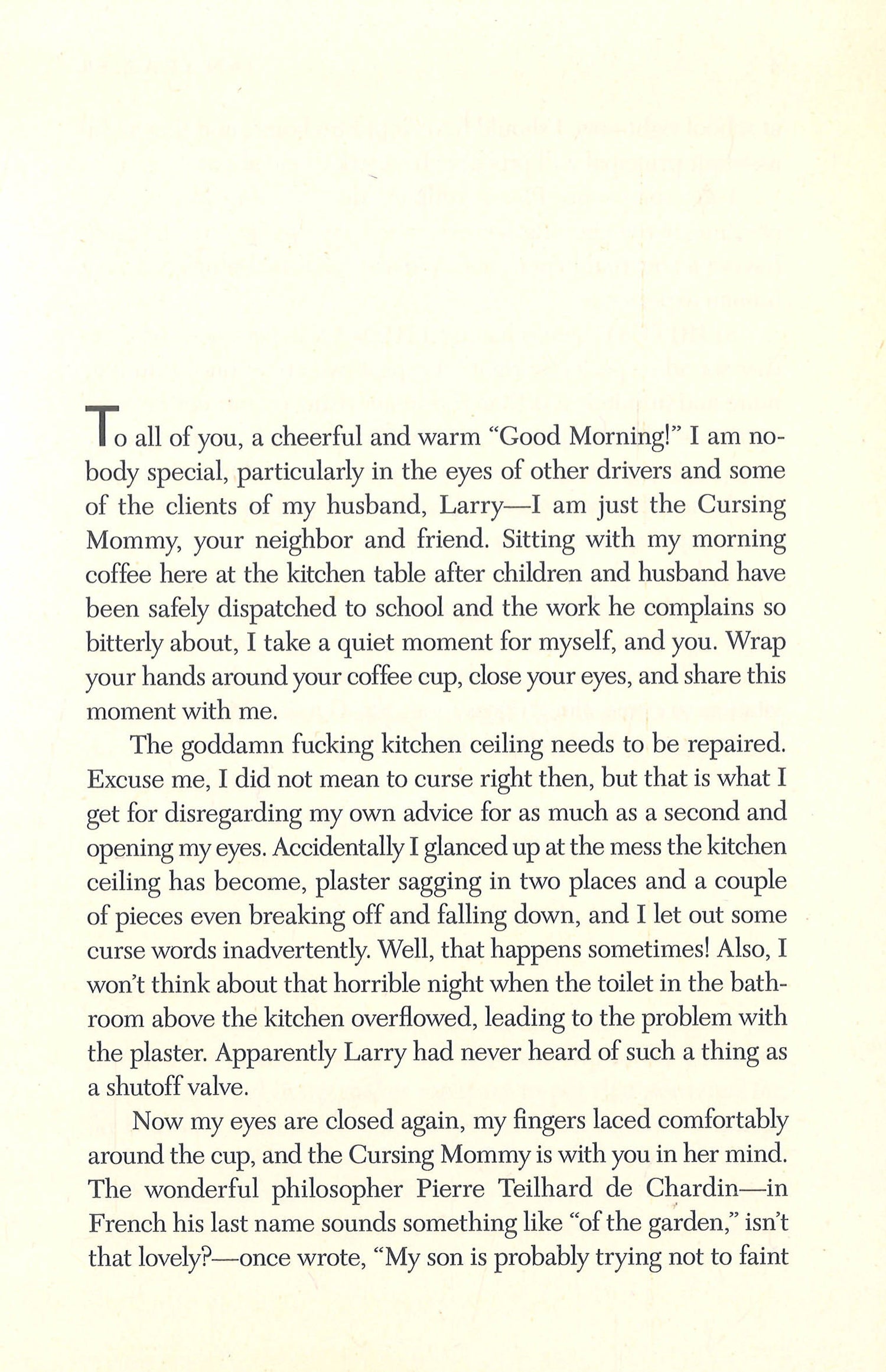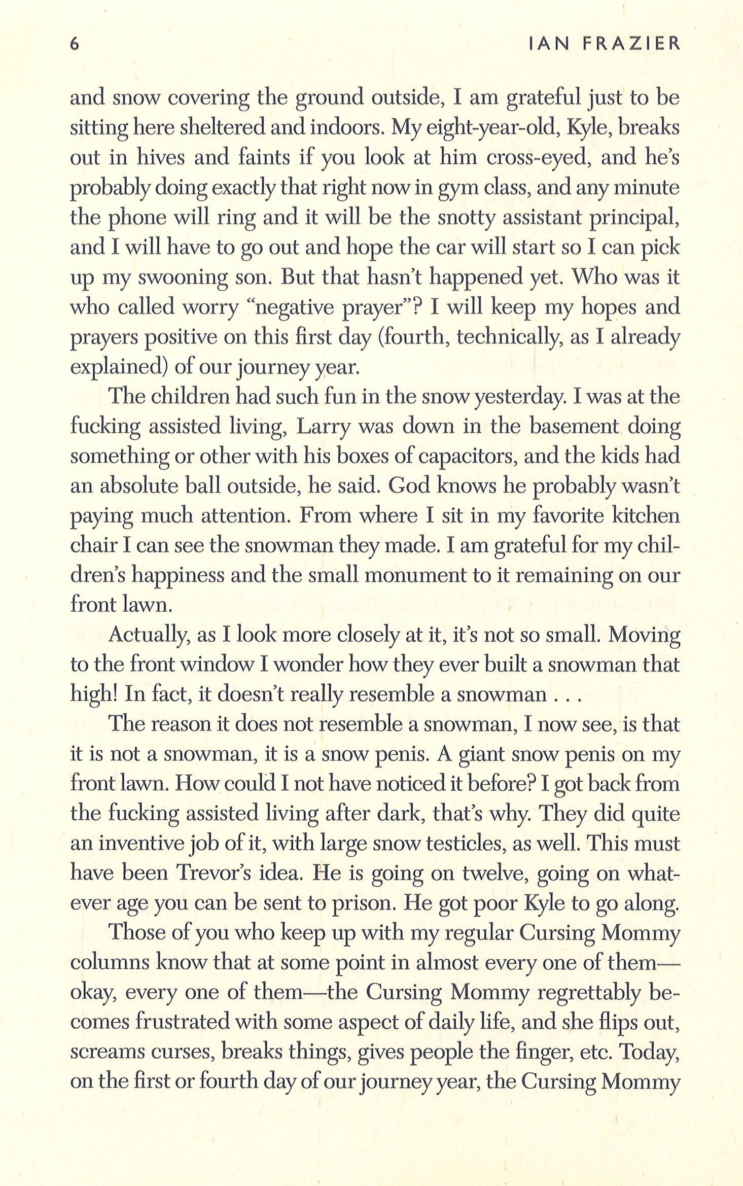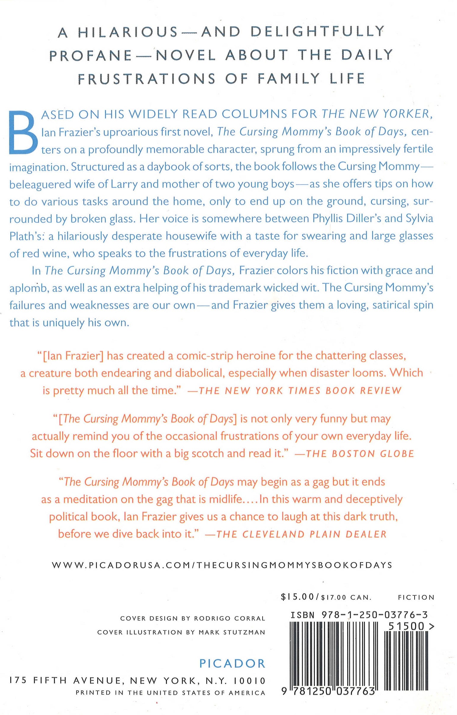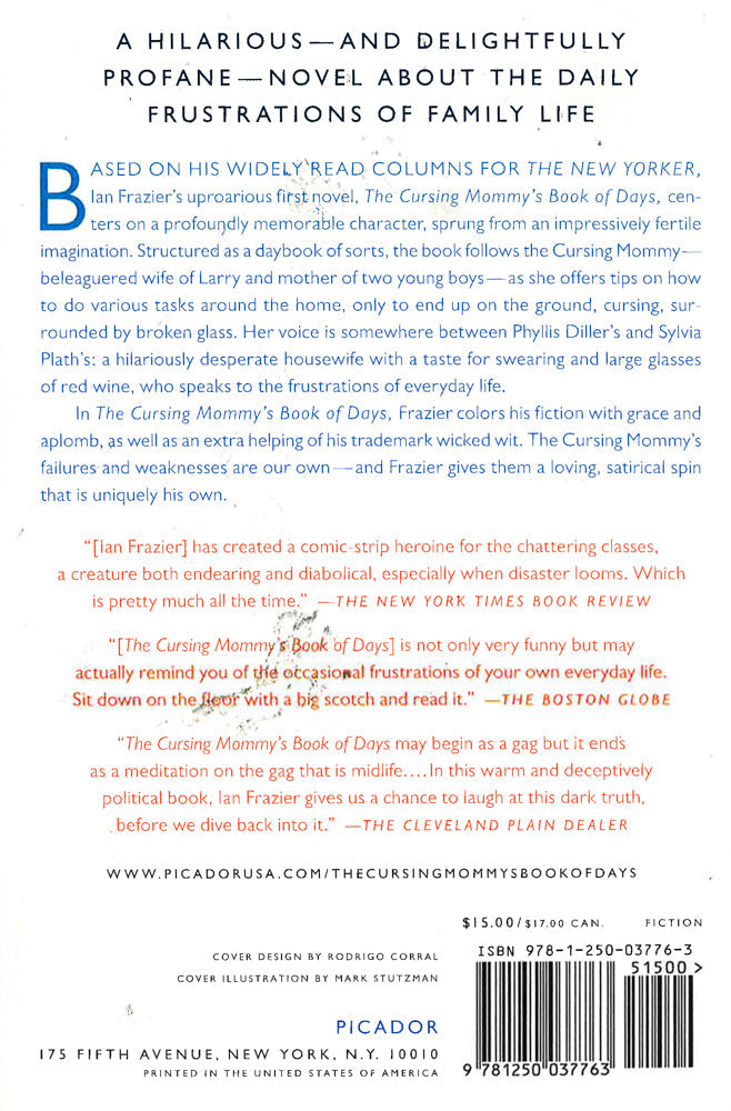 A hilarious--and delightfully profane--novel about the daily frustrations of family lifeBased on his widely read columns for The New Yorker, Ian Frazier's uproarious first novel, The Cursing Mommy's Book of Days, centers on a profoundly memorable character, sprung from an impressively fertile imagination. Structured as a daybook of sorts, the book follows the Cursing Mommy--beleaguered wife of Larry and mother of two young boys--as she offers tips on how to do various tasks around the home, only to end up on the ground, cursing, surrounded by broken glass. Her voice is somewhere between Phyllis Diller's and Sylvia Plath's: a hilariously desperate housewife with a taste for swearing and large glasses of red wine, who speaks to the frustrations of everyday life.In The Cursing Mommy's Book of Days, Frazier colors his fiction with grace and aplomb, as well as an extra helping of his trademark wicked wit. The Cursing Mommy's failures and weaknesses are our own--and Frazier gives them a loving, satirical spin that is uniquely his own.