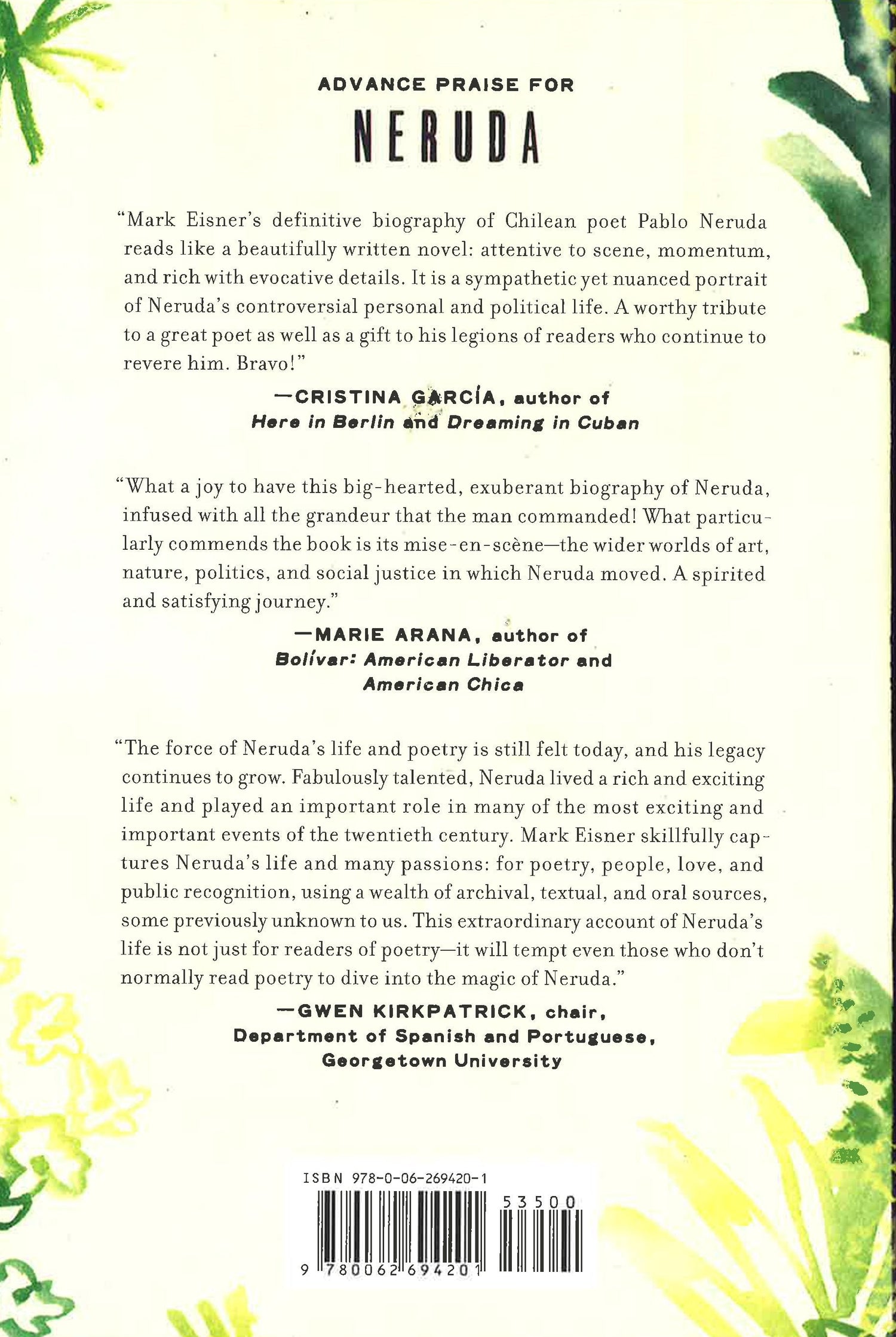 A Finalist for the PEN/Bograd Weld Prize for Biography. The most definitive biography to date of the poet Pablo Neruda, a moving portrait of one of the most intriguing and influential figures in Latin American history. Few poets have captured the global imagination like Pablo Neruda. In his native Chile, across Latin America, and in many other parts of the world, his name and legacy have become almost synonymous with liberation movements, and with the language of erotic love. Neruda: The Poet's Calling is the product of fifteen years of research by Mark Eisner, writer, translator, and documentary filmmaker. The book vividly depicts Neruda's monumental life, potent verse, and ardent belief in the "poet's obligation" to use poetry for social good. It braids together three major strands of Neruda's life-his world-revered poetry; his political engagement; and his tumultuous, even controversial, personal life-forming a single cohesive narrative of intimacy and breadth. The fascinating events of Neruda's life are interspersed with Eisner's thoughtful examinations of the poems, both as works of art in their own right and as mirrors of Neruda's life and times. The result is a book that animates Neruda's riveting story in a new way-one that offers a compelling narrative version of Neruda's life and work, undergirded by exhaustive research, yet designed to bring this colossal literary figure to a broader audience.