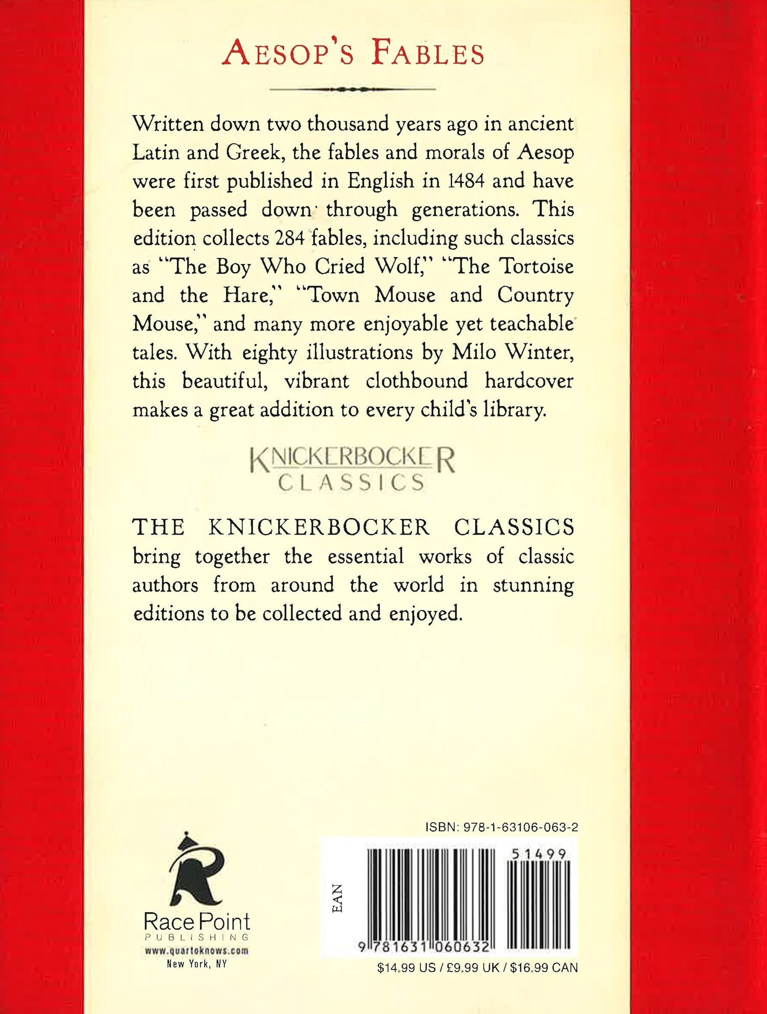 Written down two thousand years ago in ancient Latin and Greek, the fables and morals of Aesop have been passed down through generations and were first published in English in 1484. This edition collects 284 fables, including such classics as "The Boy Who Cried Wolf," "The Tortoise and the Hare," "Town Mouse and Country Mouse," and many more enjoyable, yet teachable tales. With 80 illustrations throughout, this beautiful, vibrant cloth-bound hardcover makes a great addition to every child's library. The Knickerbocker Classics bring together the essential works of classic authors from around the world in stunning editions to be collected and enjoyed.