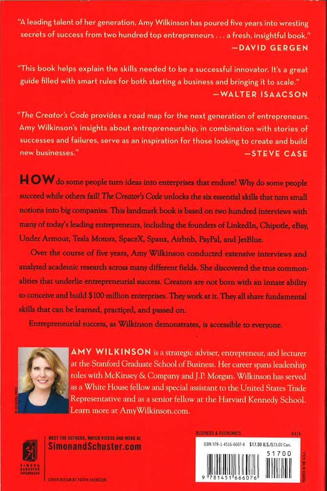 Based on in-depth interviews with more than 200 leading entrepreneurs, a lecturer at the Stanford Graduate School of Business identifies the six essential disciplines needed to transform your ideas into real-world successes. Each of us has the capacity to spot opportunities, invent products, and build businesses--even $100 million businesses. How do some people turn ideas into enterprises that endure? Why do some people succeed when so many others fail? The Creator's Code unlocks the six essential skills that turn small notions into big companies. This landmark book is based on 200 interviews with today's leading entrepreneurs including the founders of LinkedIn, Chipotle, eBay, Under Armour, Tesla Motors, SpaceX, Spanx, Airbnb, PayPal, Jetblue, Gilt Groupe, Theranos, and Dropbox. Over the course of five years, Amy Wilkinson conducted rigorous interviews and analyzed research across many different fields. From the creators of the companies ranging from Yelp to Chobani to Zipcar, she found that entrepreneurial success works in much the same way. Creators are not born with an innate ability to conceive and build $100 million enterprises. They work at it. They all share fundamental skills that can be learned, practiced, and passed on. The Creator's Code reveals six skills that make creators of all kinds of endeavors breakthrough. These skills aren't rare gifts or slim chance talents. Entrepreneurship, Wilkinson demonstrates, is accessible to everyone.