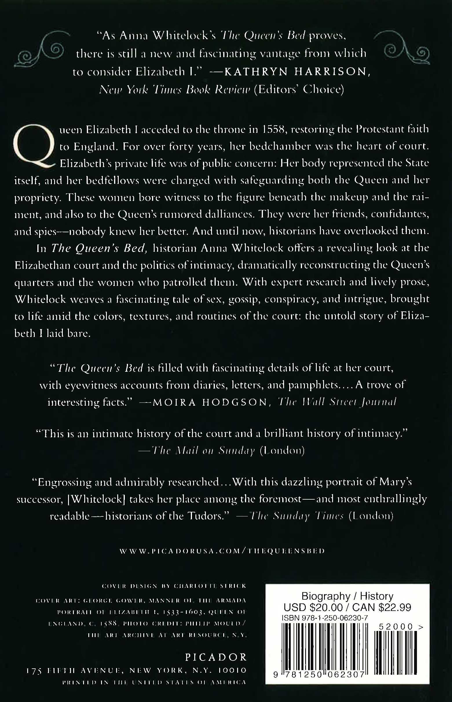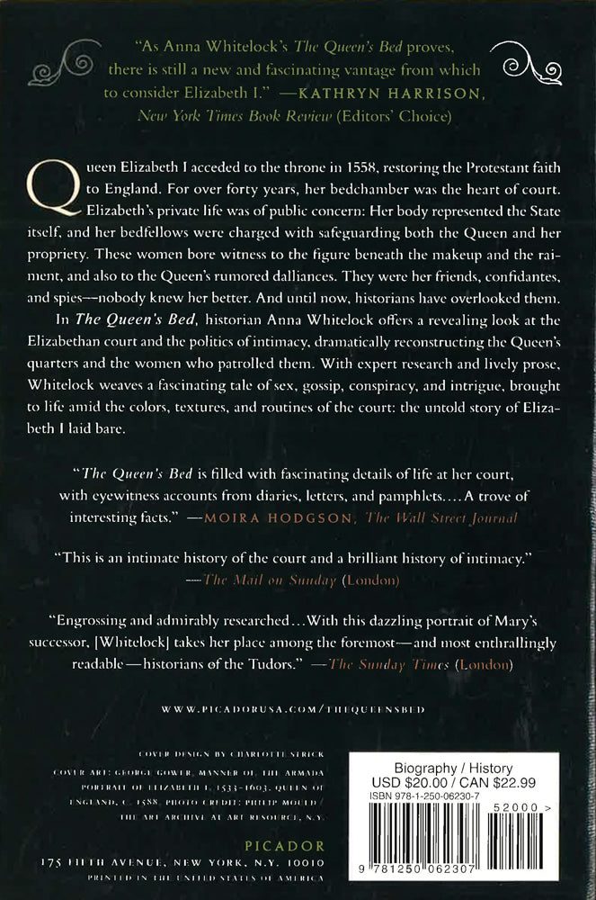 WINNER OF THE 2015 PEN/JACQUELINE BOGRAD WELD AWARD FOR BIOGRAPHY Queen Elizabeth I acceded to the throne in 1558, restoring the Protestant faith to England. For over forty years, her bedchamber was the heart of court. Elizabeth's private life was of public concern: Her body represented the State itself, and her bedfellows were charged with safeguarding both the Queen and her propriety. These women bore witness to the figure beneath the makeup and the raiment, and also to the Queen's rumored dalliances. They were her friends, confidantes, and spies-nobody knew her better. And until now, historians have overlooked them. In The Queen's Bed, the historian Anna Whitelock offers a revealing look at the Elizabethan court and the politics of intimacy, dramatically reconstructing the Queen's quarters and the women who patrolled them. With expert research and lively prose, Whitelock weaves a fascinating tale of sex, gossip, conspiracy, and intrigue, brought to life amid the colors, textures, and routines of the court: the untold story of Elizabeth I laid bare.