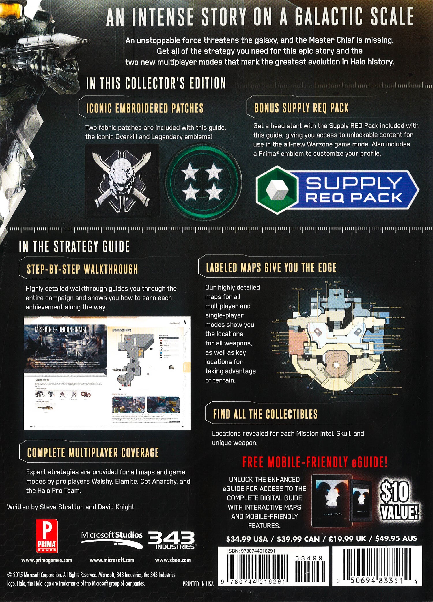 Halo 5: Guardians Collector's Edition Strategy Guide includes . . . Iconic Embroidered Patches - Two fabric patches are included with this guide, the iconic Overkill and Legendary emblems! Bonus Supply REQ PACK - Get a head start with the Supply REQ Pack included with this guide, giving you access to unlockable content for use in the all-new Warzone game mode. Also includes a Prima® emblem to customize your profile. Labeled Maps Give You the Edge - Our highly detailed maps for all multiplayer and singleplayer modes show you the locations for all weapons, as well as key locations for taking advantage of terrain. Step-by-Step Walkthrough - Highly detailed walkthrough guides you through the entire campaign and shows you how to earn each achievement along the way. Complete Multiplayer Coverage - Expert strategies are provided for all maps and game modes by pro players Walshy, Elamite, Cpt Anarchy, and the Halo Pro Team. Find all the Collectibles - Locations revealed for each Mission Intel, Skull, and unique weapon. FREE Mobile-Friendly eGuide - Unlock the enhanced eGuide for access to the complete digital guide with interactive maps and mobile-friendly features.