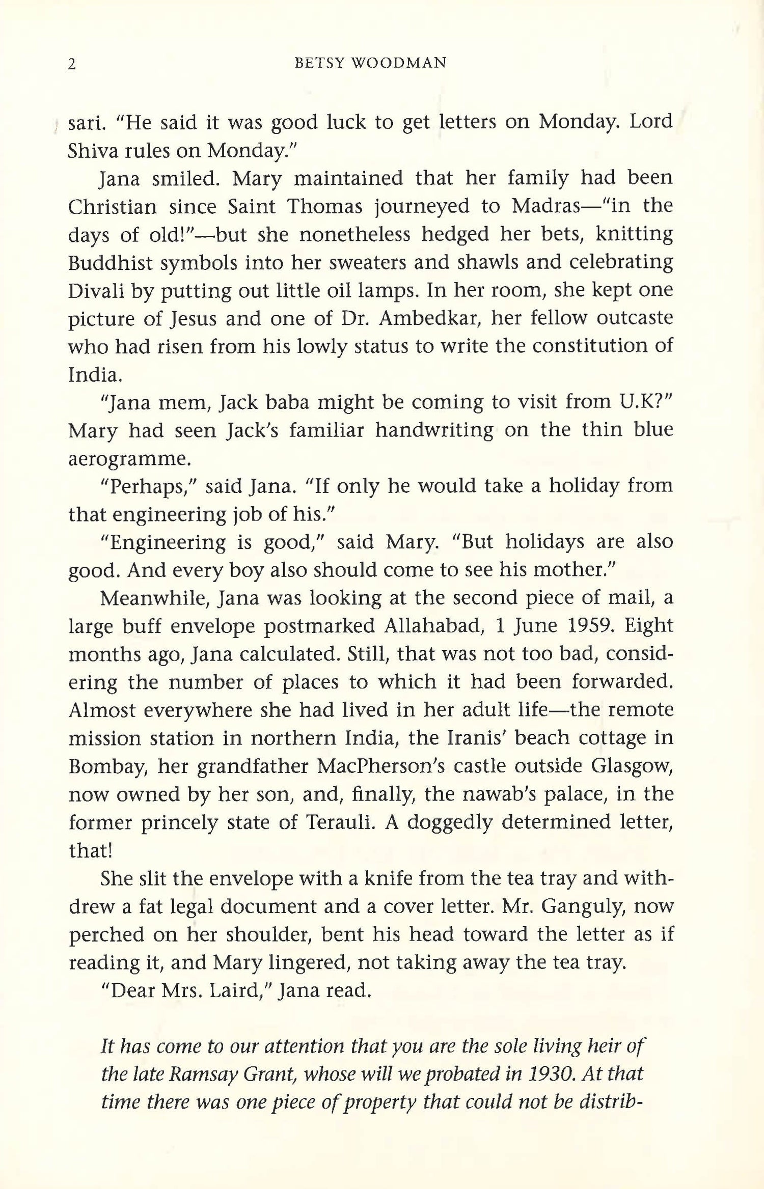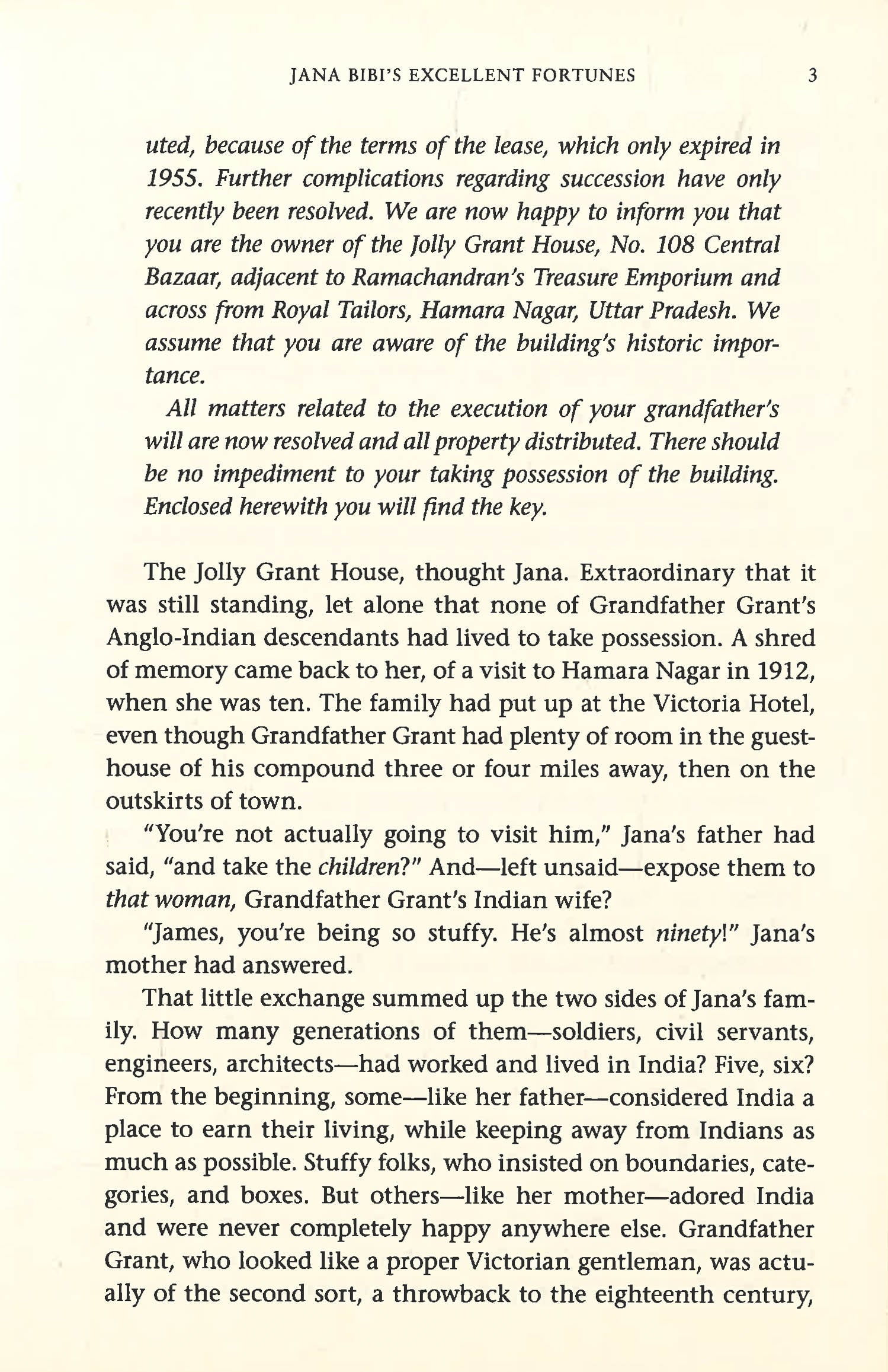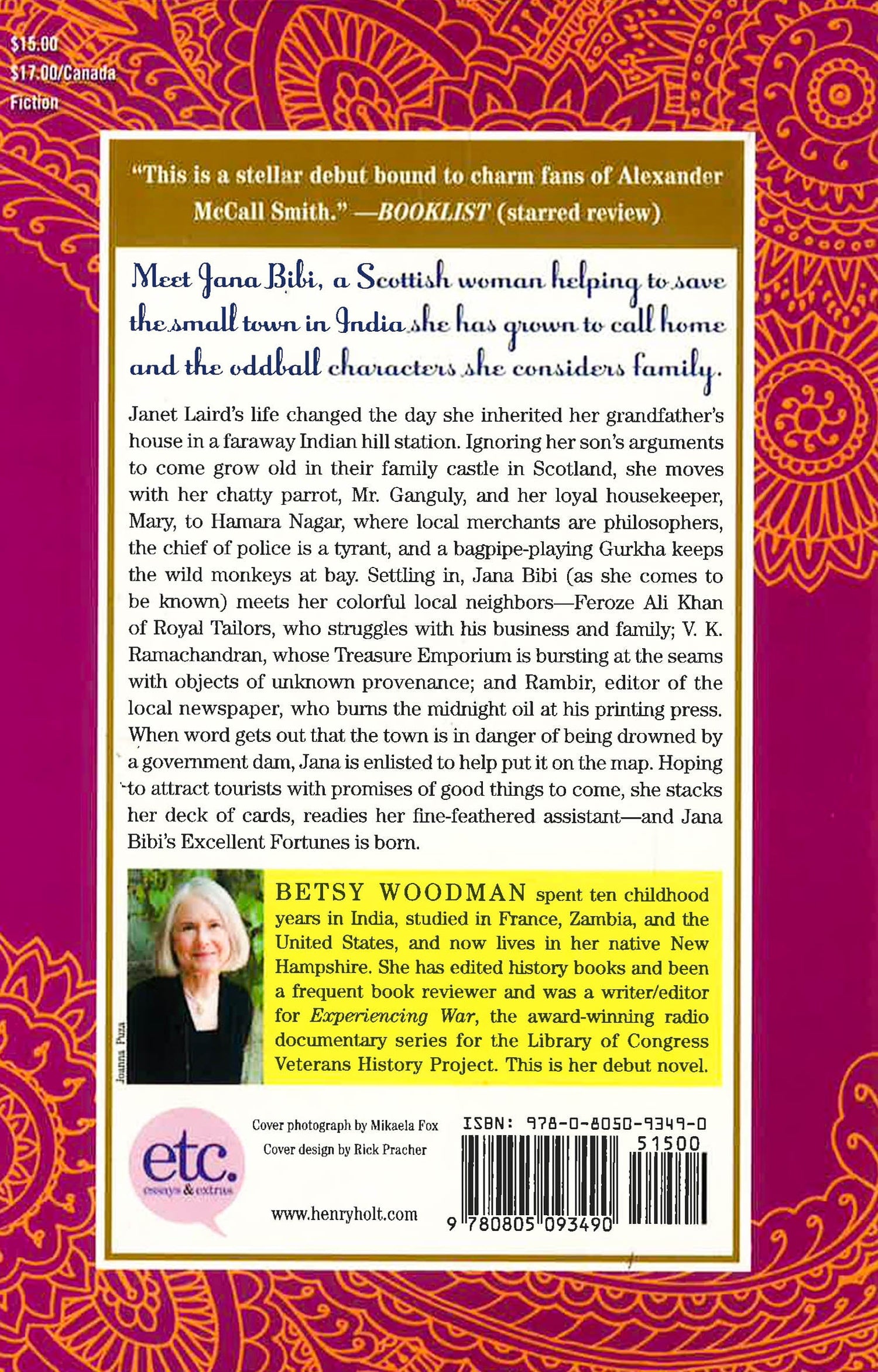 Meet Jana Bibi, a Scottish woman helping to save the small town in India she has grown to call home and the oddball characters she considers family Janet Laird's life changed the day she inherited her grandfather's house in a faraway Indian hill station. Ignoring her son's arguments to come grow old in their family castle in Scotland, she moves with her chatty parrot, Mr. Ganguly and her loyal housekeeper, Mary, to Hamara Nagar, where local merchants are philosophers, the chief of police is a tyrant, and a bagpipe-playing Gurkha keeps the wild monkeys at bay. Settling in, Jana Bibi (as she comes to be known) meets her colorful local neighbors - Feroze Ali Khan of Royal Tailors, who struggles with his business and family, V.K. Ramachandran, whose Treasure Emporium is bursting at the seams with objects of unknown provenance, and Rambir, editor of the local newspaper, who burns the midnight oil at his printing press. When word gets out that the town is in danger of being drowned by a government dam, Jana is enlisted to help put it on the map. Hoping to attract tourists with promises of good things to come, she stacks her deckof cards, readies her fine-feathered assistant - and Jana Bibi's Excellent Fortunes is born.
