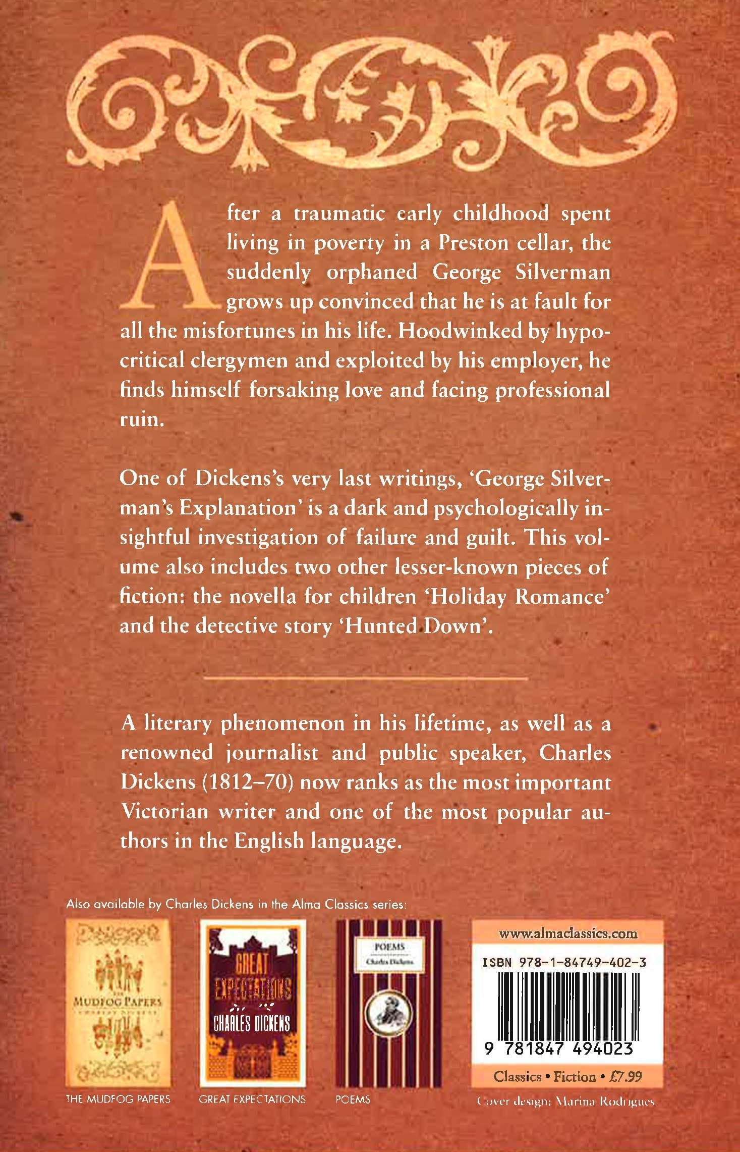 One of Dickens's very last writings, 'George Silverman's Explanation' is a dark and psychologically insightful investigation of failure and guilt. This volume also includes two other lesser-known pieces of fiction by Dickens: the novella for children 'Holiday Romance' and the detective story 'Hunted Down'.