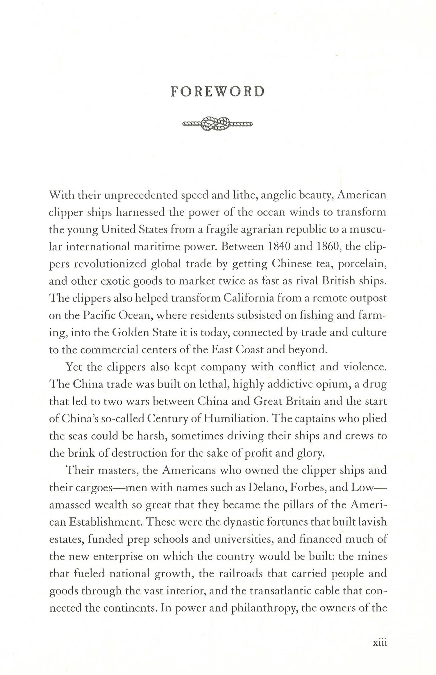 "With the verse of a natural dramatist" (The Christian Science Monitor), Steven Ujifusa tells the story of a handful of cutthroat competitors who raced to build the fastest, finest, most profitable clipper ships to carry their precious cargo to American shores. They were visionary, eccentric shipbuilders, debonair captains, and socially ambitious merchants with names like Forbes and Delano-men whose business interests took them from the cloistered confines of China's expatriate communities to the sin city decadence of Gold Rush-era San Francisco, and from the teeming hubbub of East Boston's shipyards and to the lavish sitting rooms of New York's Hudson Valley estates.