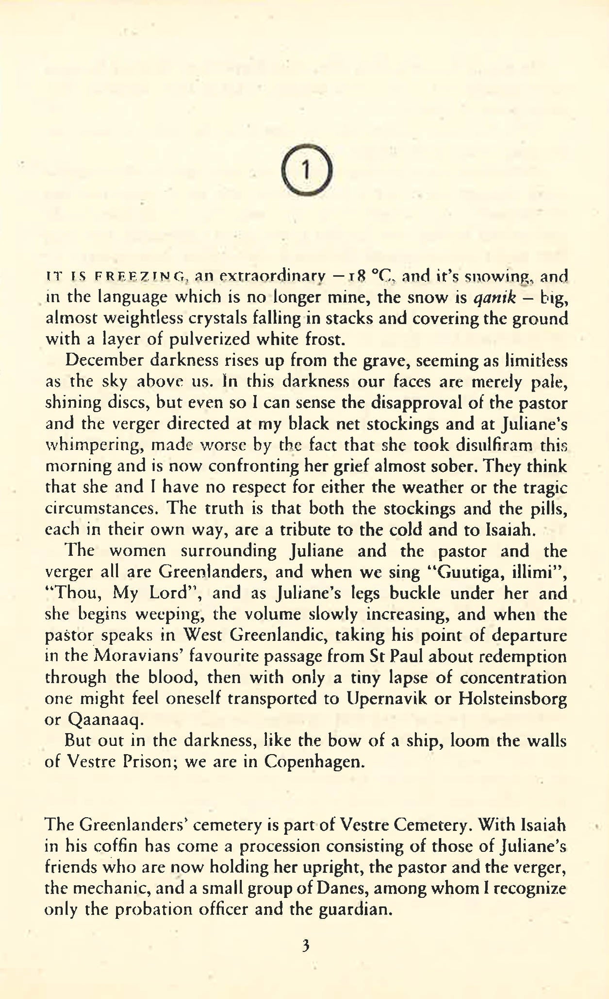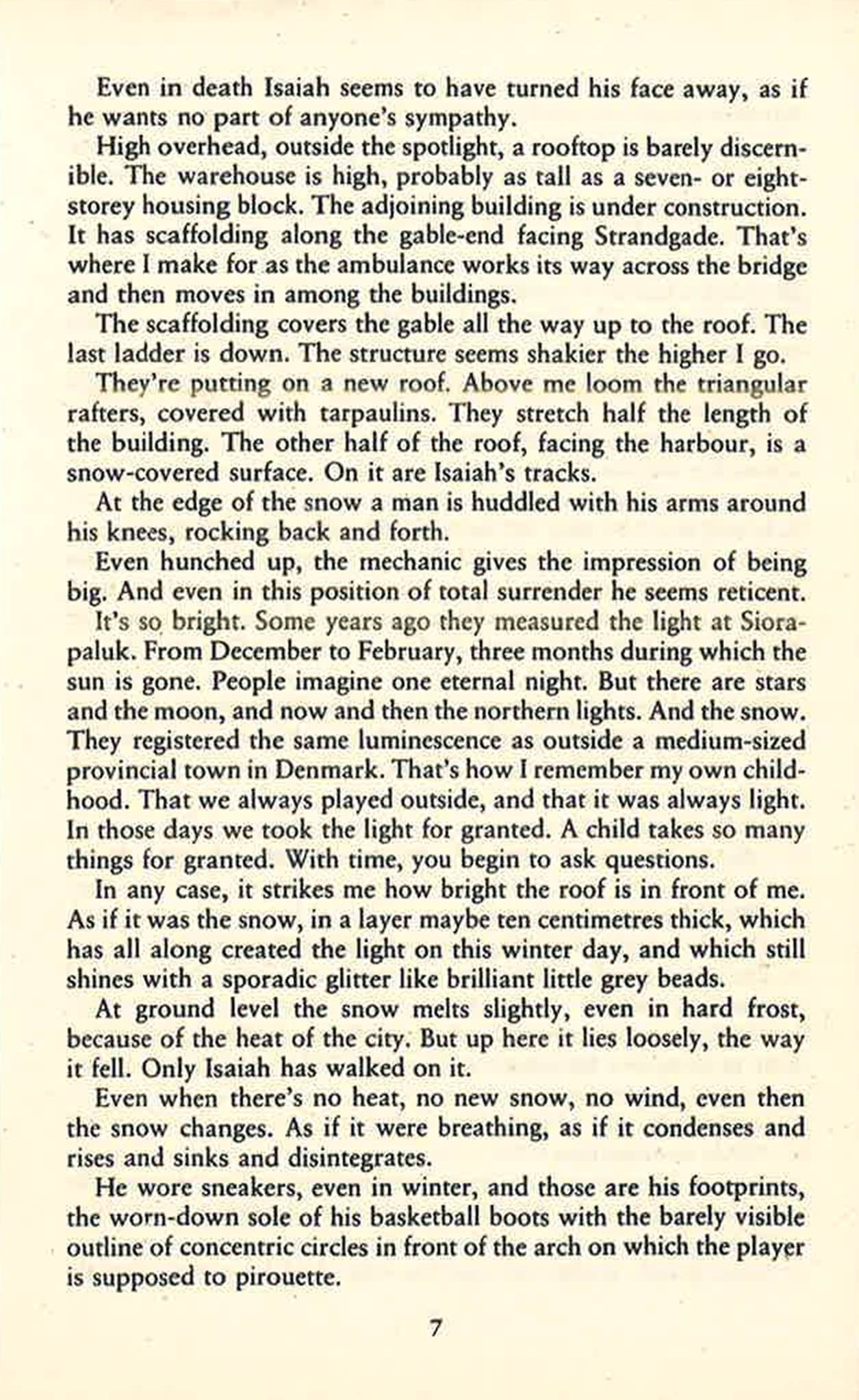 One snowy day in Copenhagen, six-year-old Isaiah falls to his death from a city rooftop.The police pronounce it an accident. But Isaiah's neighbour, Smilla, suspects murder.She embarks on a dangerous quest to find the truth, following a path of clues as clear to her as footsteps in the snow.