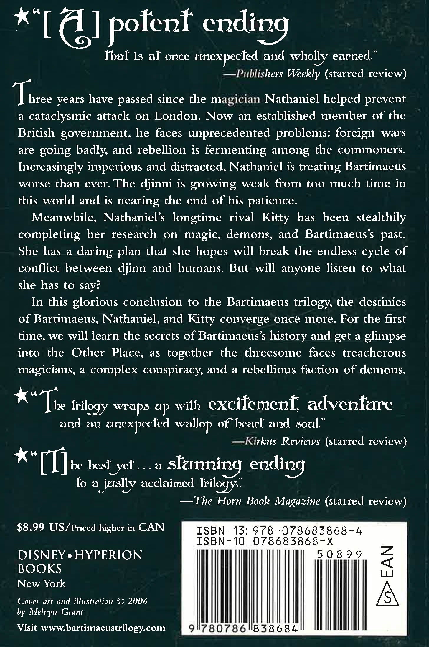 Three years after the events of The Golem's Eye, the young magician Nathaniel is an established member of the British Government. But he faces unprecedented problems: foreign wars are going badly and Britain's enemies are mounting attacks close to London. Increasingly distracted, he is treating Bartimaeus worse than ever: the long-suffering djinni is growing weak from too much time in this world, and his patience is at an end. Meanwhile, undercover in London, Kitty has been stealthily completing her research into magic and Bartimaeus' past. She hopes to break the endless cycle of conflict between djinn and humans - but will she be able to get anyone to listen? Before any of these problems can be resolved, disaster strikes London from an unexpected source and the destinies of Bartimaeus, Nathaniel, and Kitty are thrown together once more.