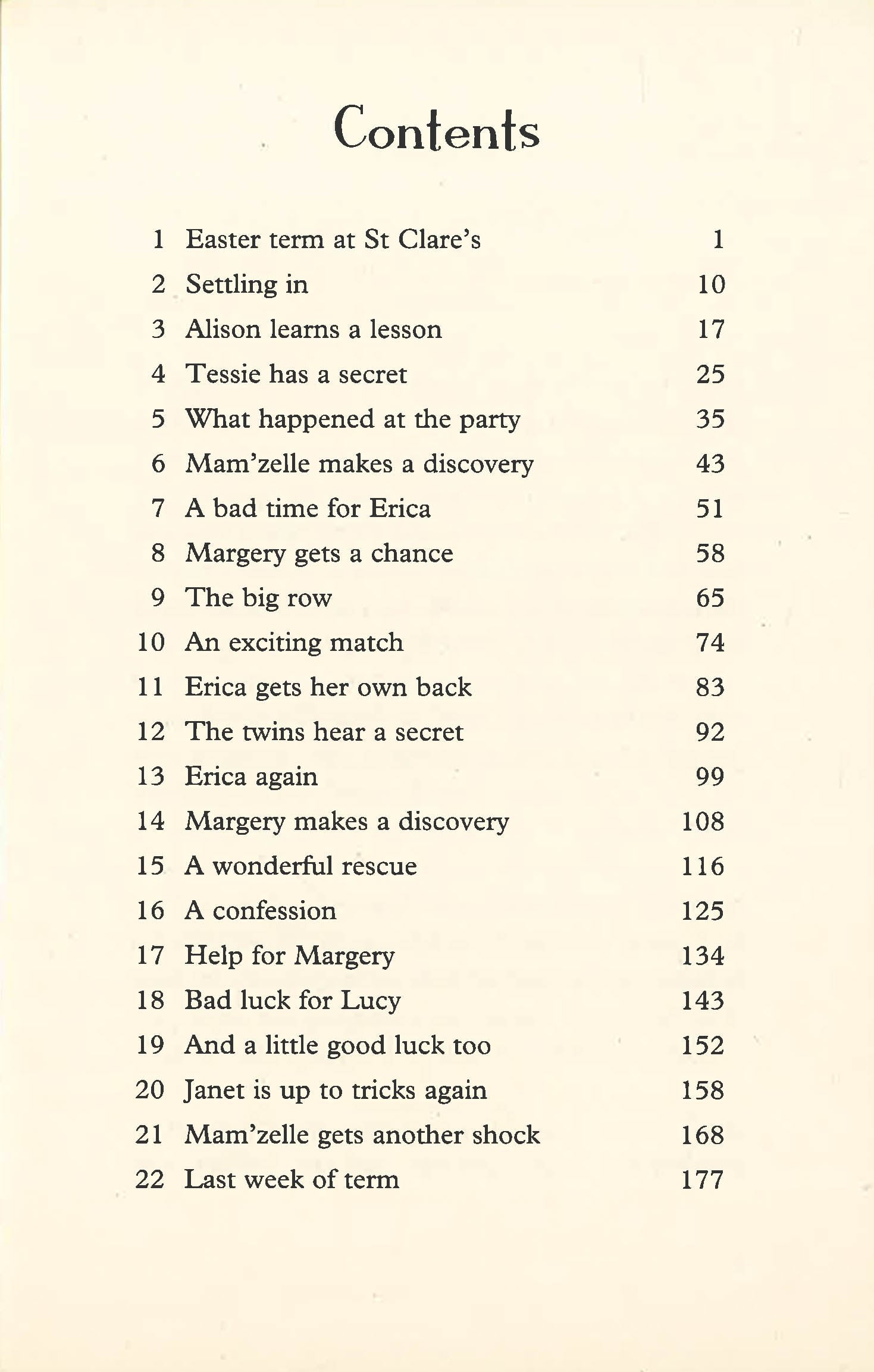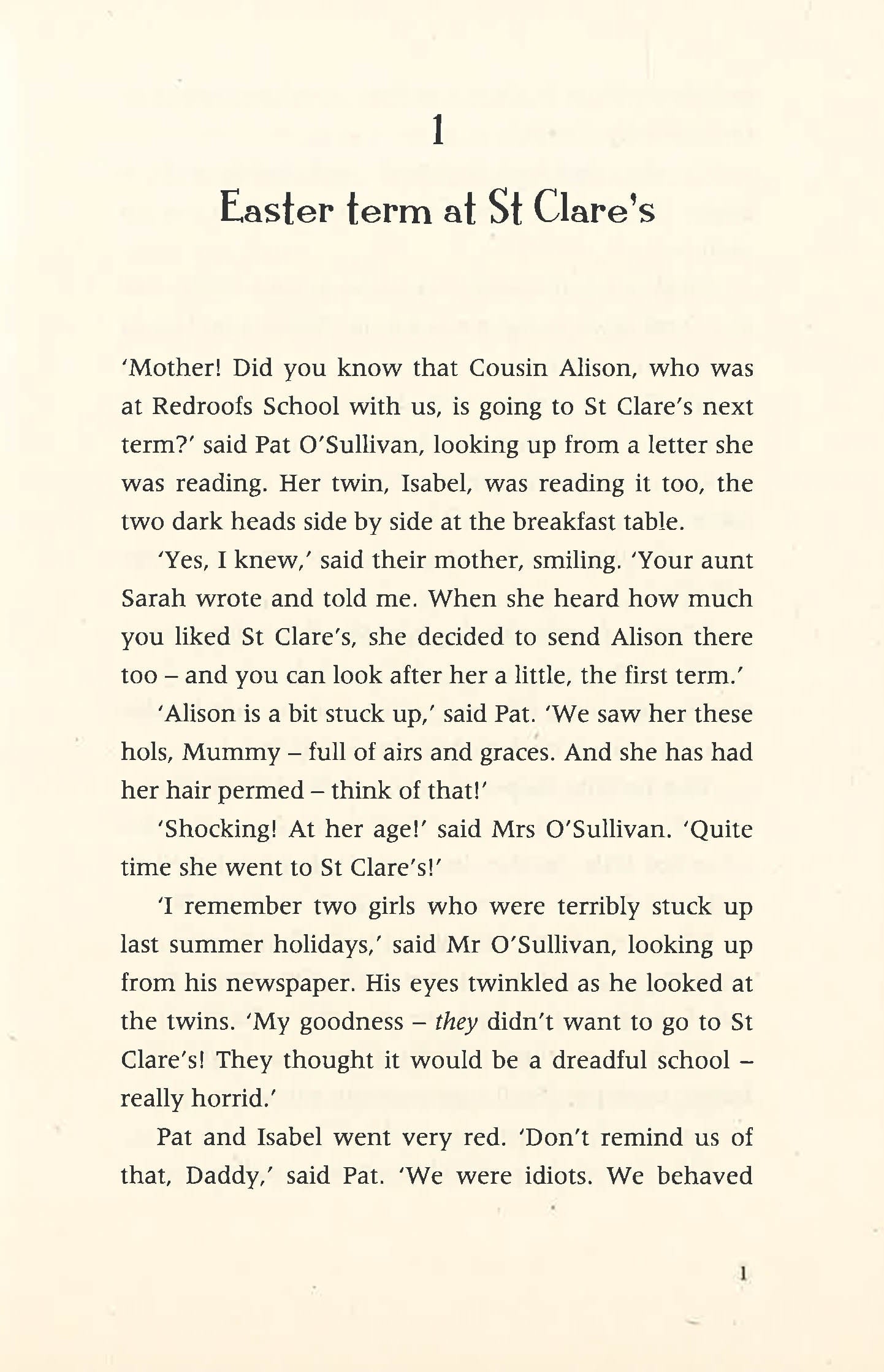 Schooldays at St Clare’s are never dull for twins Pat and Isabel O’Sullivan and their friends. The twins have decided to study hard and stay out of trouble this term. But they just can’t help themselves – poor Mam’zelle had better watch out for their tricks. There’s mischief at St Clare’s.