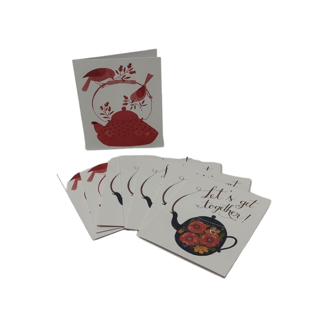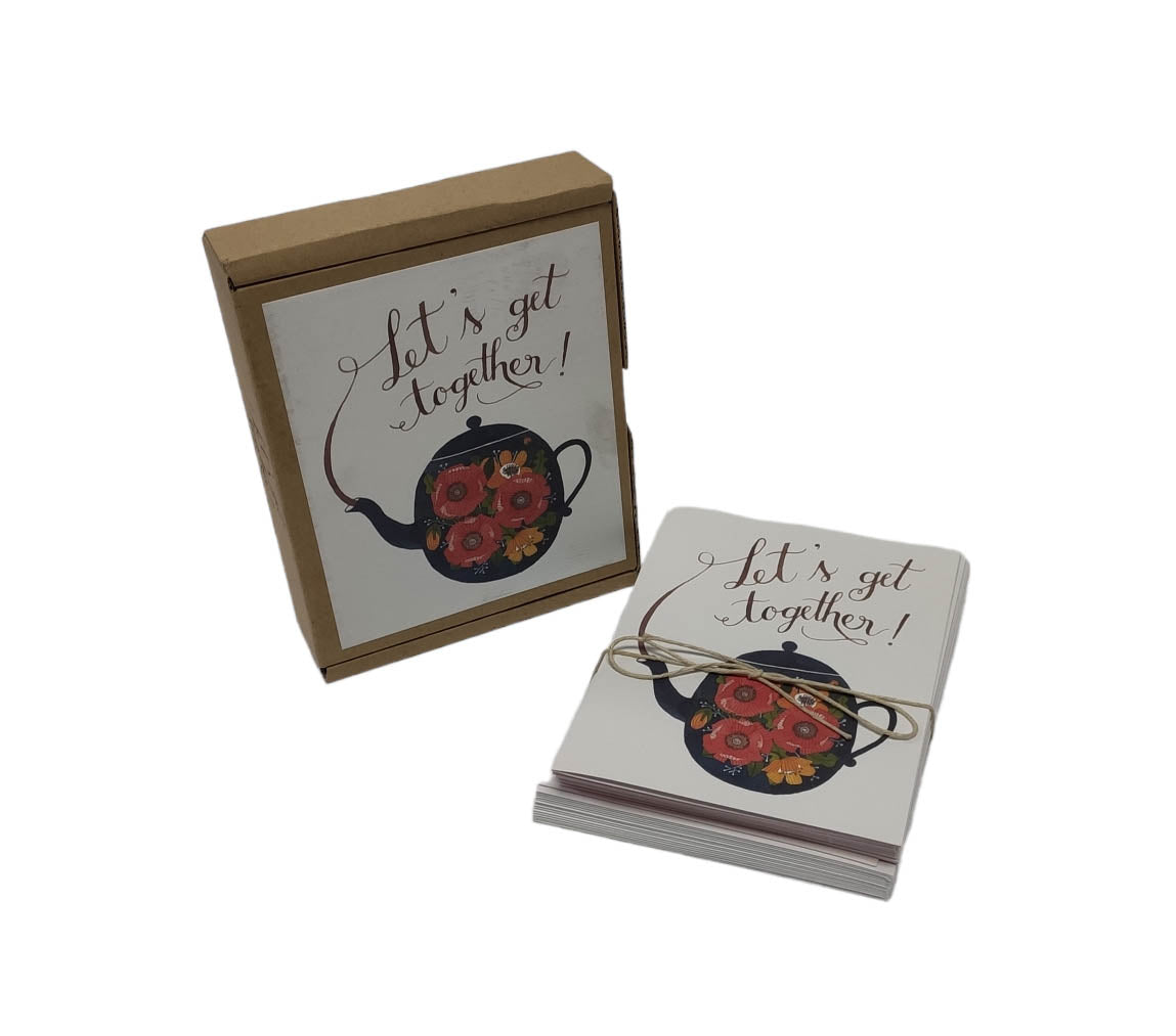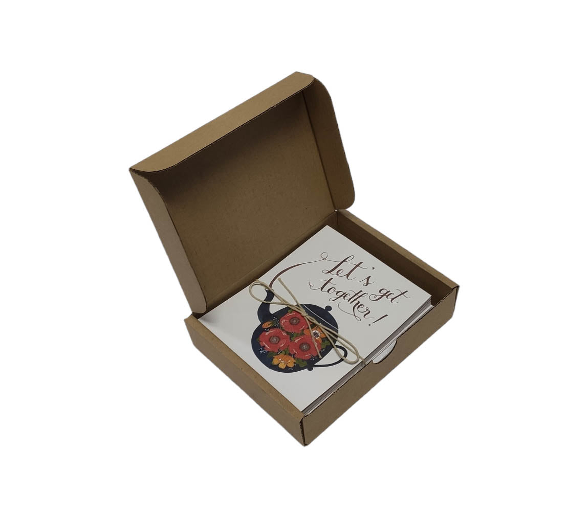 Send cheerful greetings to loved ones with these charming environmentally-friendly boxed notecards featuring vintage-inspired teapot illustrations. These blank cards are also perfect to use as invitations for any type of social gathering. Packaged in a corrugated cardboard box, our GreenNotes combine old-world charm with modern design. Cards, envelopes, and packaging are printed with soy-based inks and made with environmentally-friendly materials. 16 notecards and envelopes, 8 each of 2 images. Cards, envelopes and packaging made with recycled materials. Packaged in a corrugated flip-top box. Cards printed on a luxurious uncoated paper stock. Cards and envelopes bundled together with a decorative twine tie.