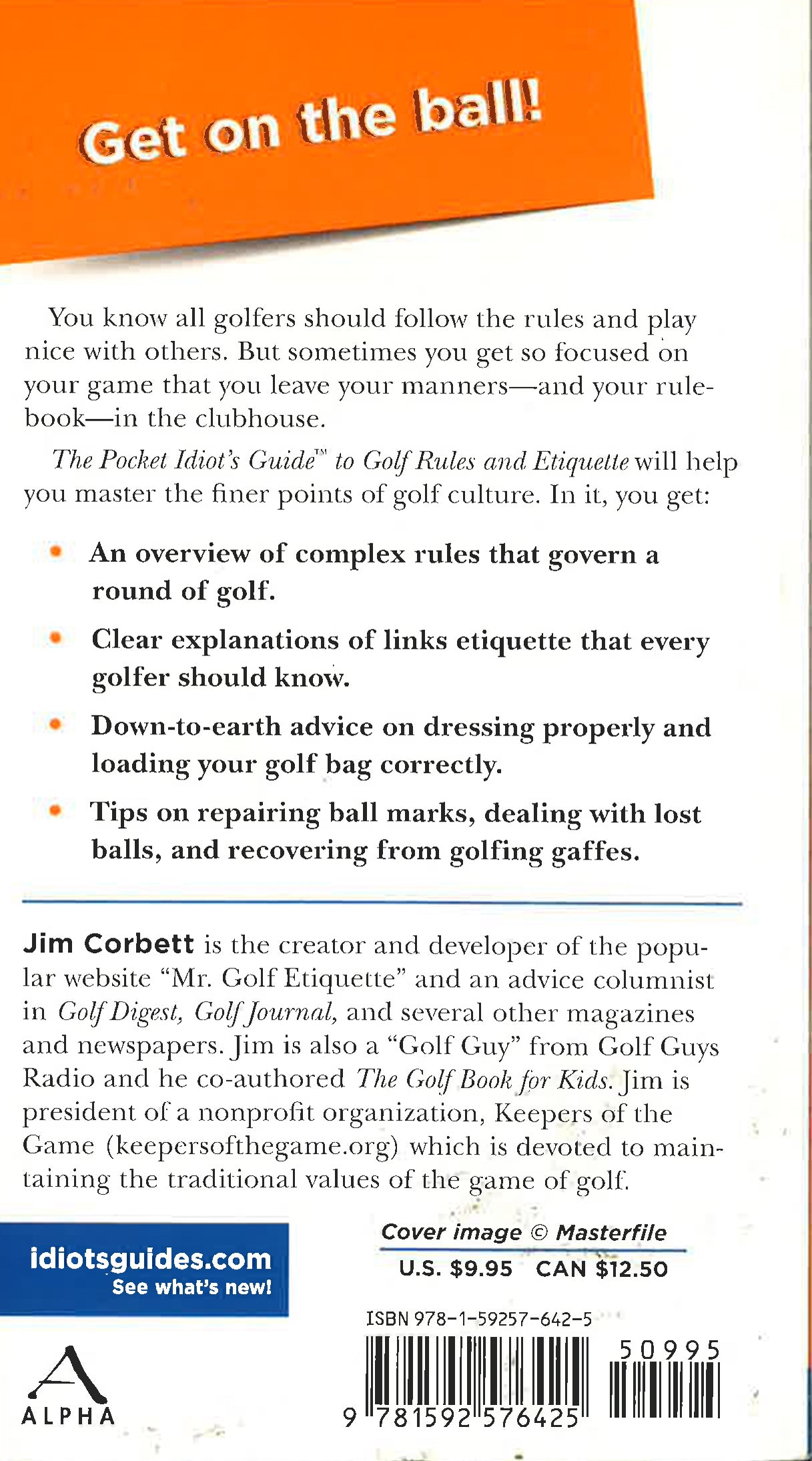 Golf rules! Written in clear, simple terms, this guide explains golf s rules and etiquette by taking readers through a round of golf. From dressing properly to putting the final ball on the 18th green, Jim Corbett (nationally recognized as Mr. Golf Etiquette ) covers all the do s and don ts and even lets readers know which rules are safe to bend when playing with friends. Perfect size for a golfer s back pocket By one of the country s most famous authorities on the subject