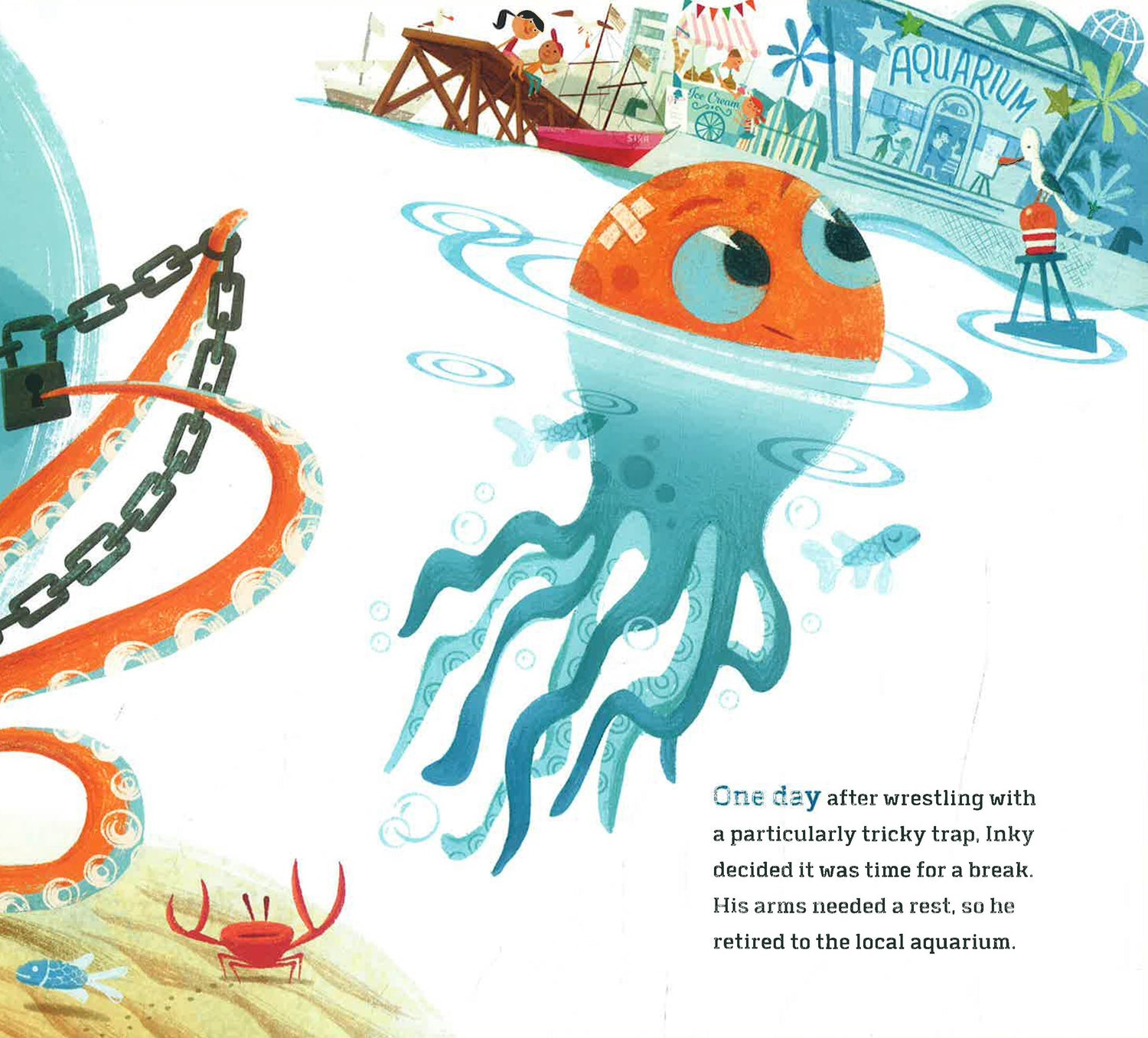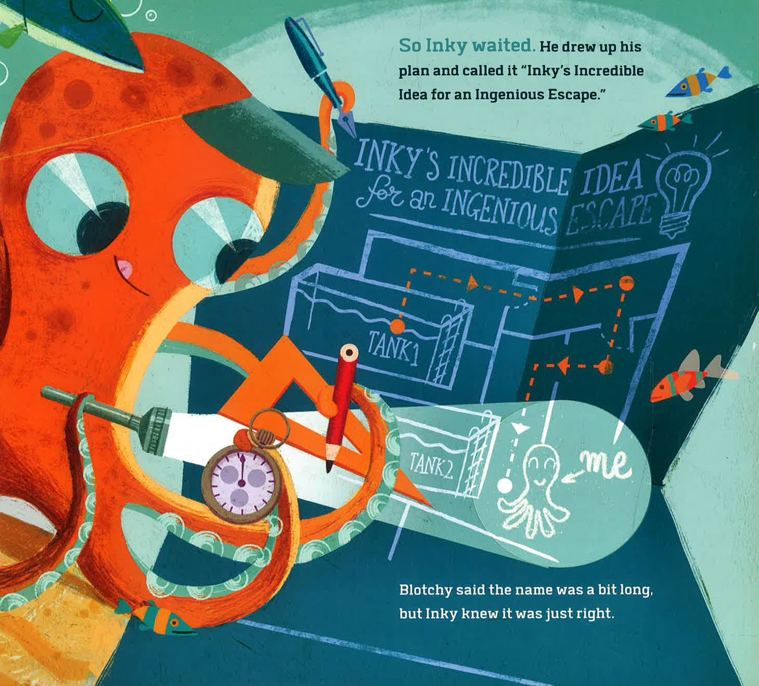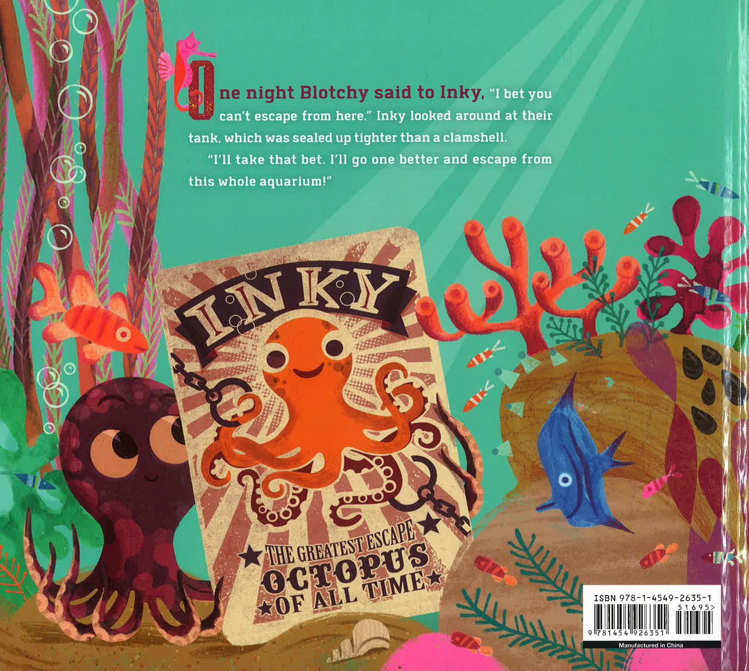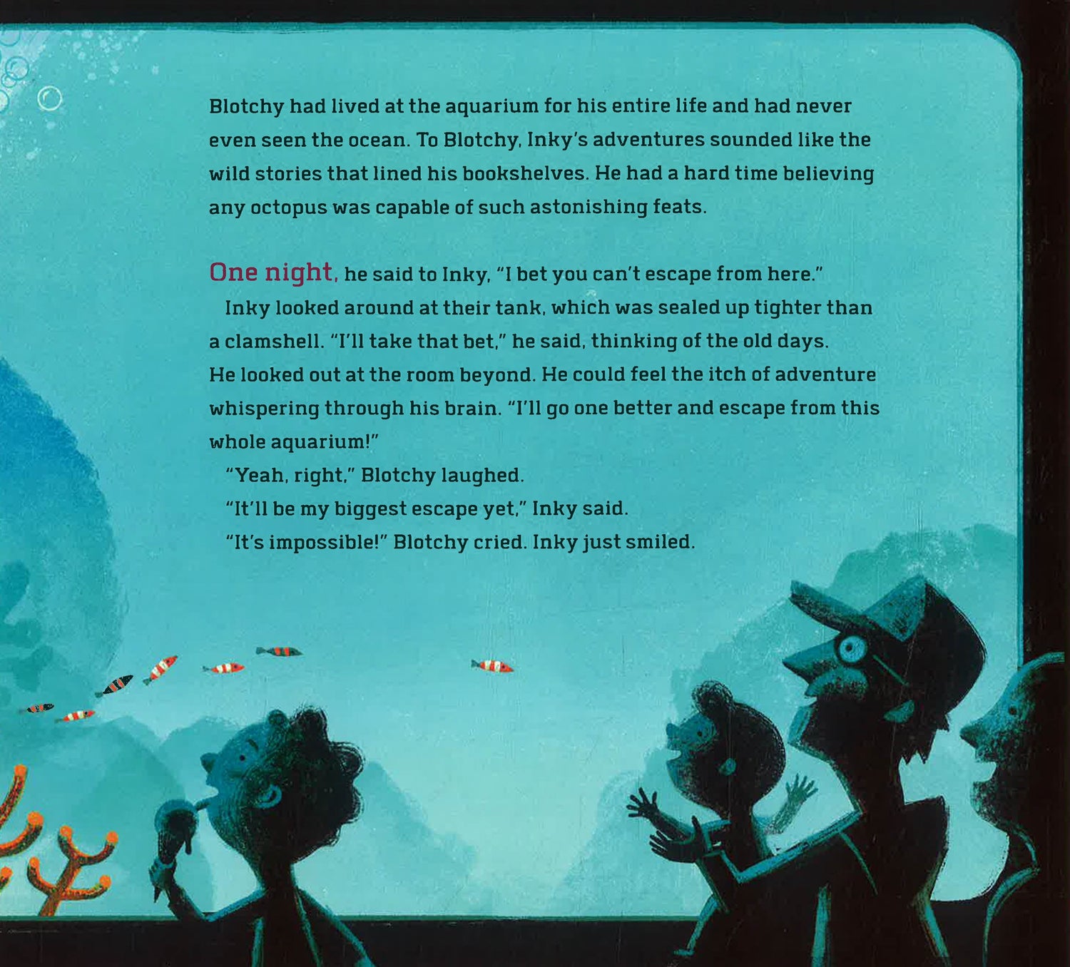In April 2016, The New York Times published an article about an octopus named Inky who escaped from the National Aquarium of New Zealand through a drainpipe and into the sea. In this charming fictionalized account, Inky, worn out from his exciting life in the ocean, has retired to the aquarium. There he quietly plays cards, makes faces at the visitors, and regales his tankmate Blotchy with tales of his past adventures. Then Blotchy dares Inky to make one more great escape: out of their tank. Will Inky succeed?