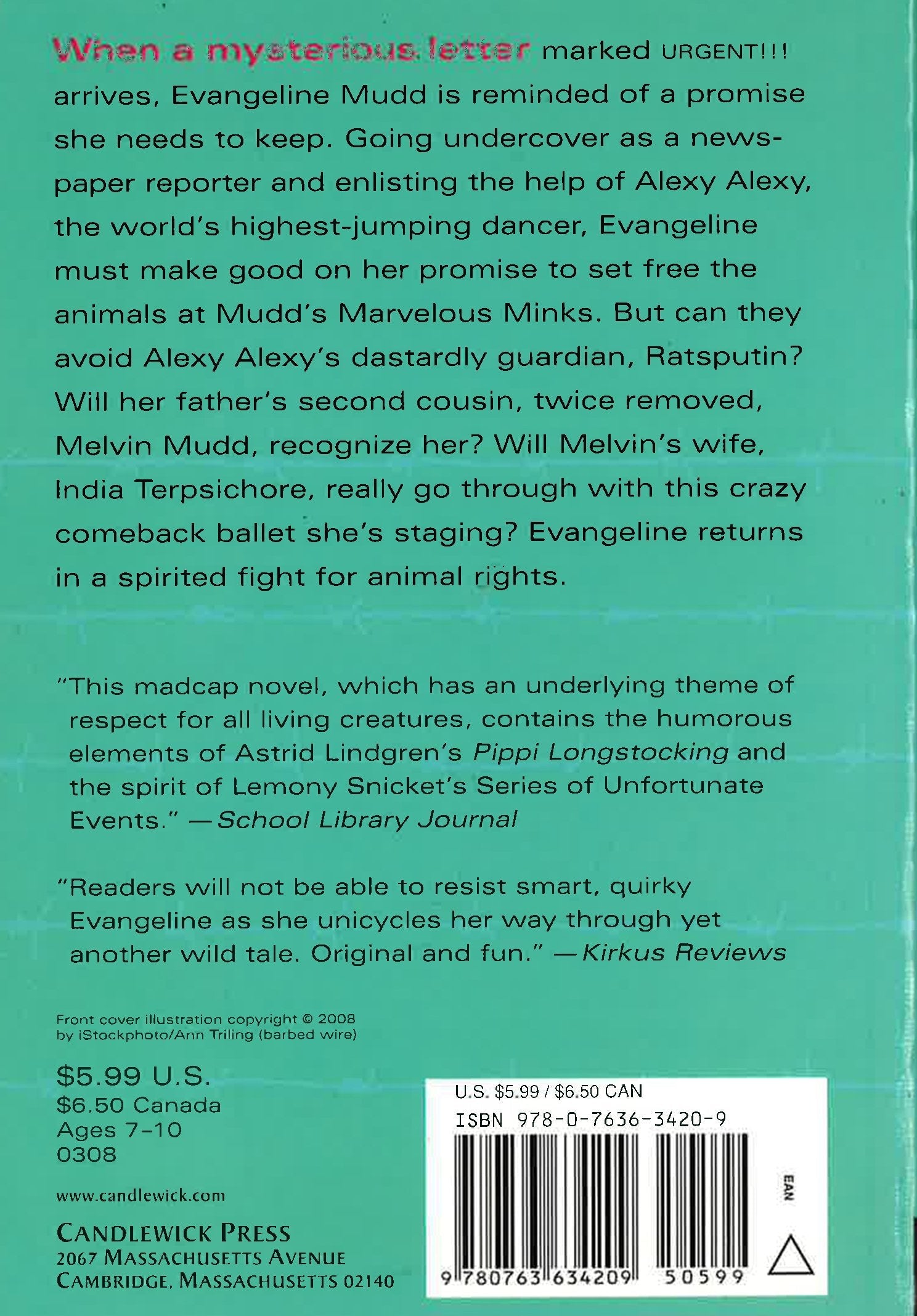 When a letter marked URGENT!!! arrives at Evangeline Mudd’s bungalow, she is reminded of a promise she needs to keep: to set free the animals at Mudd’s Marvelous Minks. Going undercover as a newspaper reporter, and with the help of Alexy Alexy, the world’s highest-jumping dancer, the spirited heroine is back to join the fight for animal rights in a funny, fast-paced, whimsically illustrated novel.