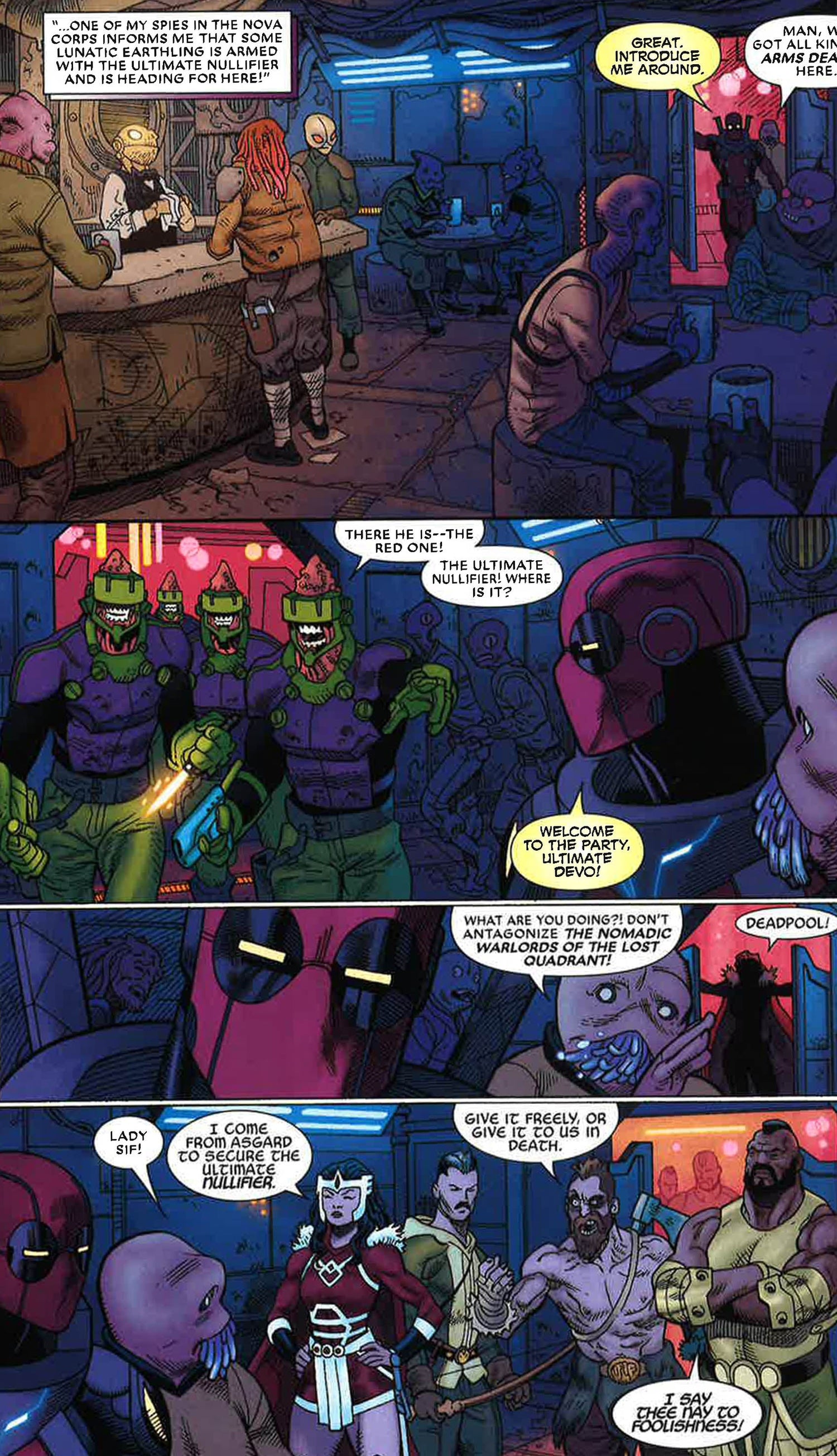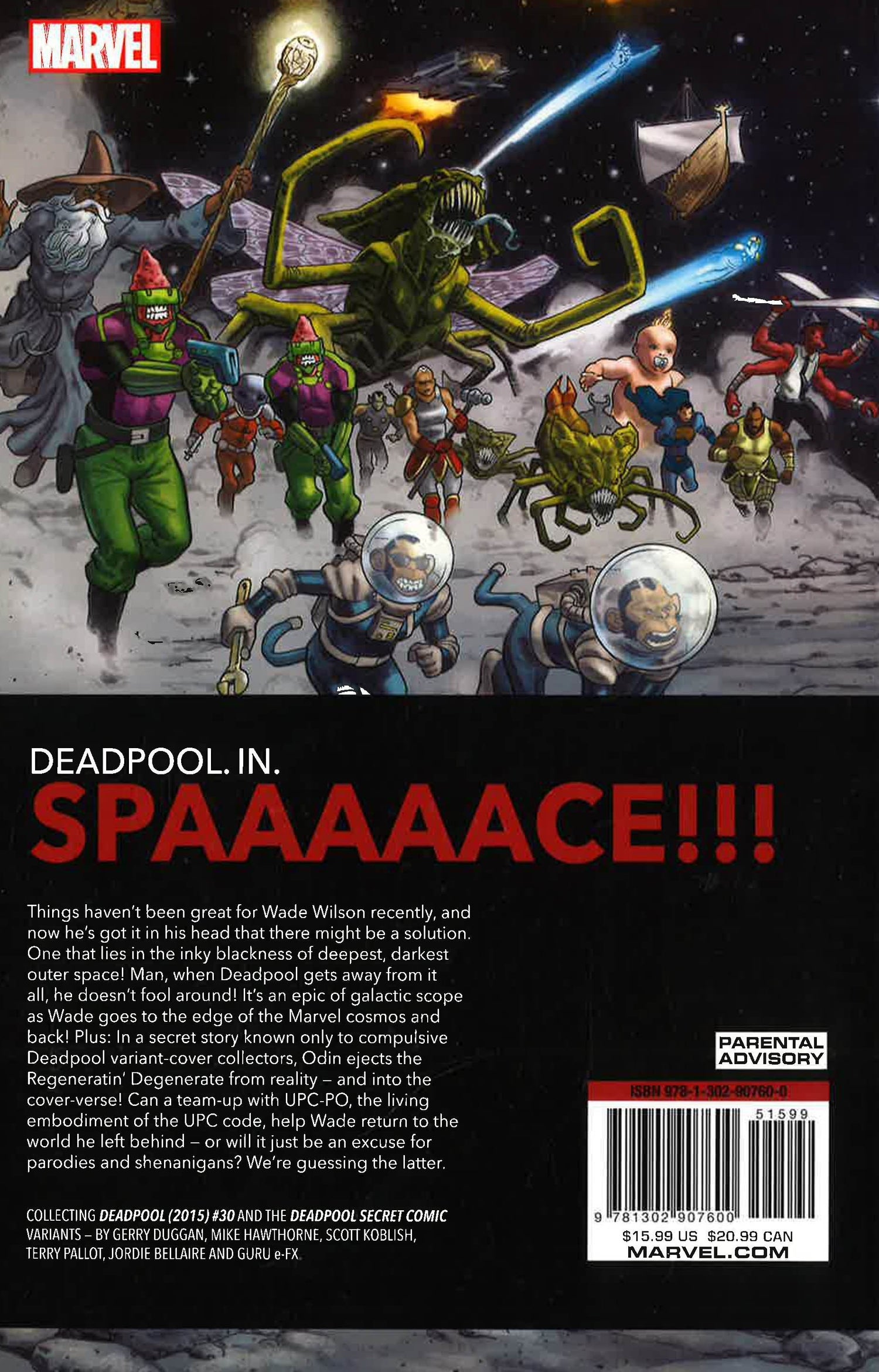 Deadpool. In. Spaaaaace!!! Wade Wilson is heading off Earth on a personal mission - one that will land him in all manner of cosmic trouble! Plus, a secret story known only to compulsive Deadpool variant cover collectors, as Odin ejects Deadpool from reality -and into the cover-verse! Can a team-up with UPC-PO, the living embodiment of the UPC code, help Wade return to the world he left behind...or will it just be an excuse for parodies and shenanigans? We're guessing the latter.