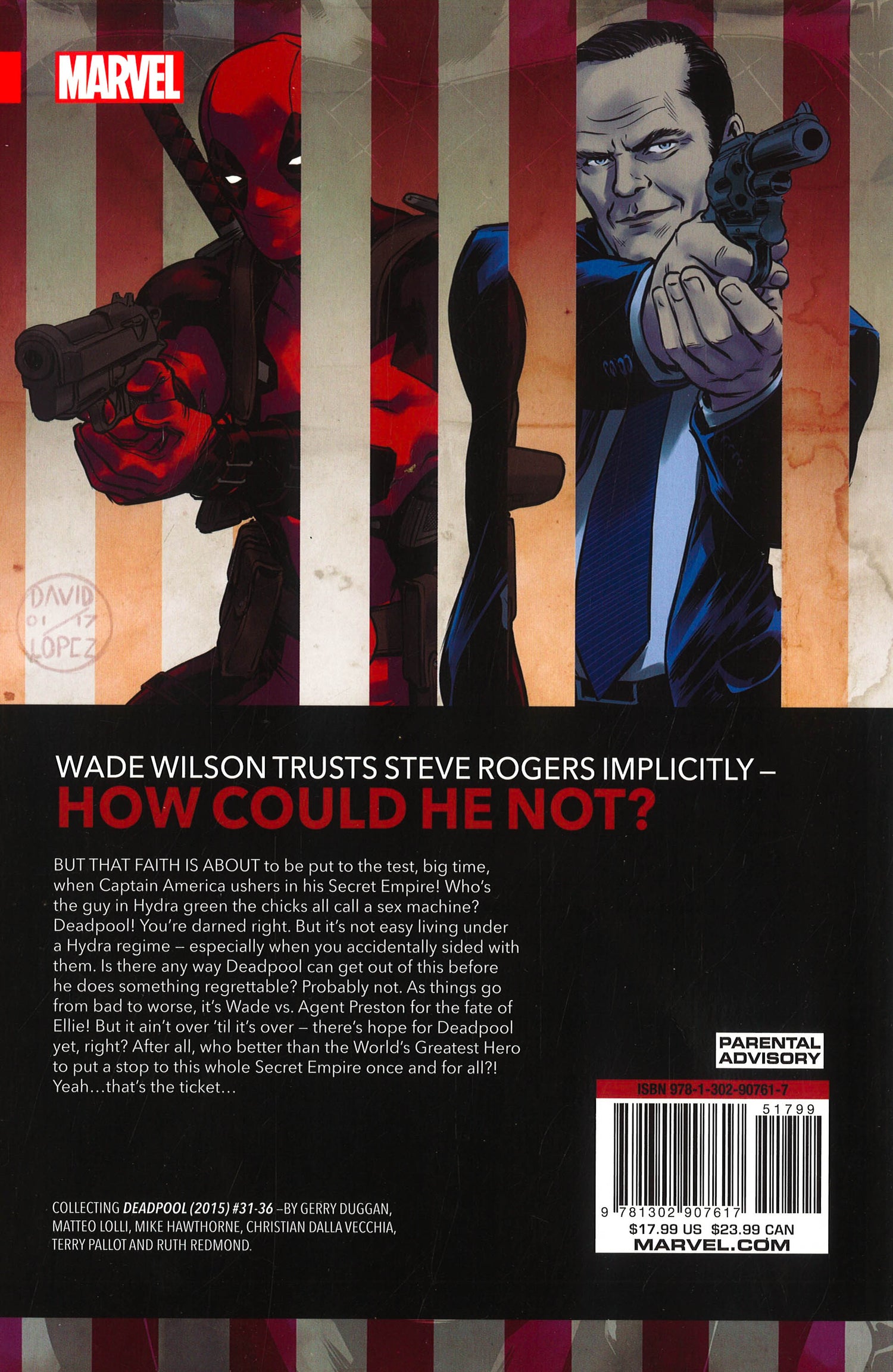 Deadpool takes on the event storyline of 2017: Secret Empire! But which side will he choose - and how will he face down the fallout? Wade Wilson trusts Steve Rogers implicitly - how could he not? But that trust is about to be put to the test, big-time! Deadpool has spent his super hero career cracking jokes, but this situation is serious - and big changes are coming for the Merc With A Mouth... COLLECTING: DEADPOOL 31-35