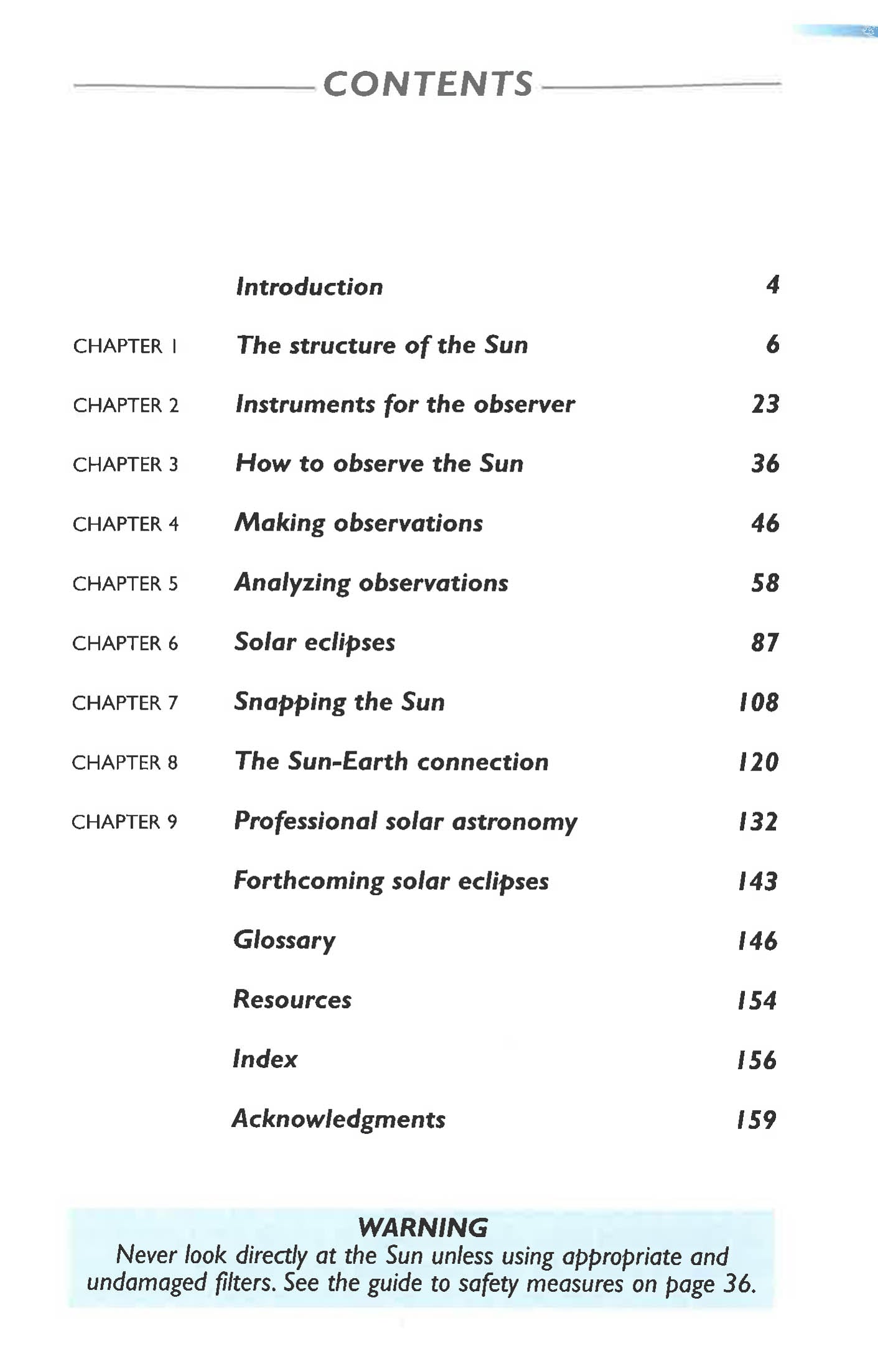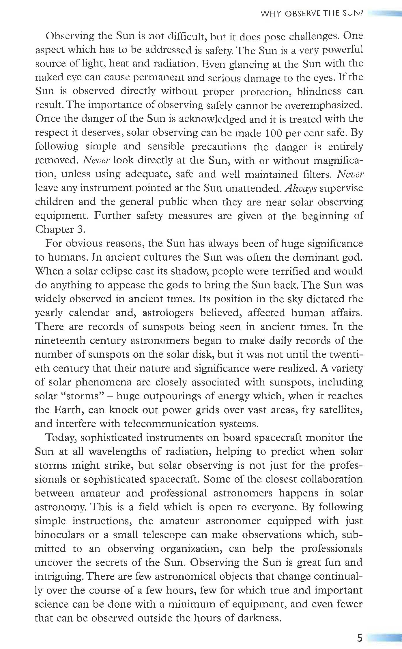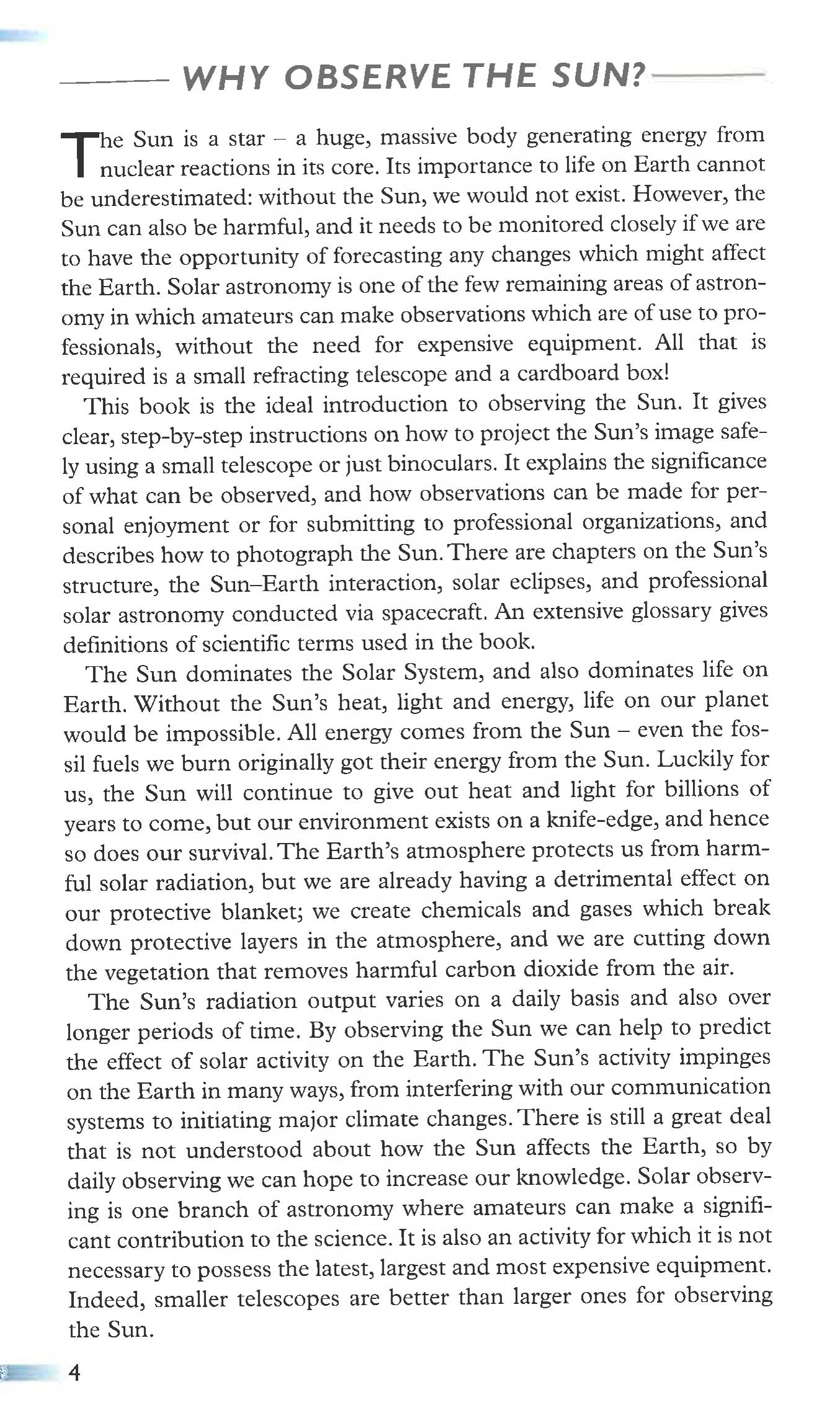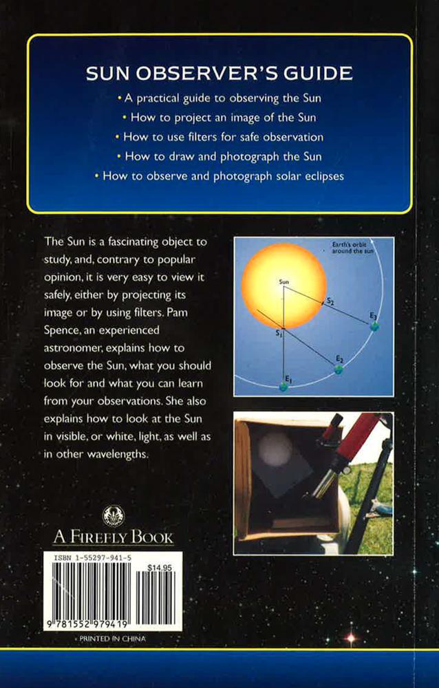 The sun is a fascinating object to study, and, contrary to popular opinion, it is very easy to view it safely, either by projecting its image or by using filters. Pam Spence, an experienced astronomer, explains how to observe the Sun, what you should look for and what you can learn from your observation. She also explains how to look at the Sun in visible, or white, light, as well as in other wavelengths.