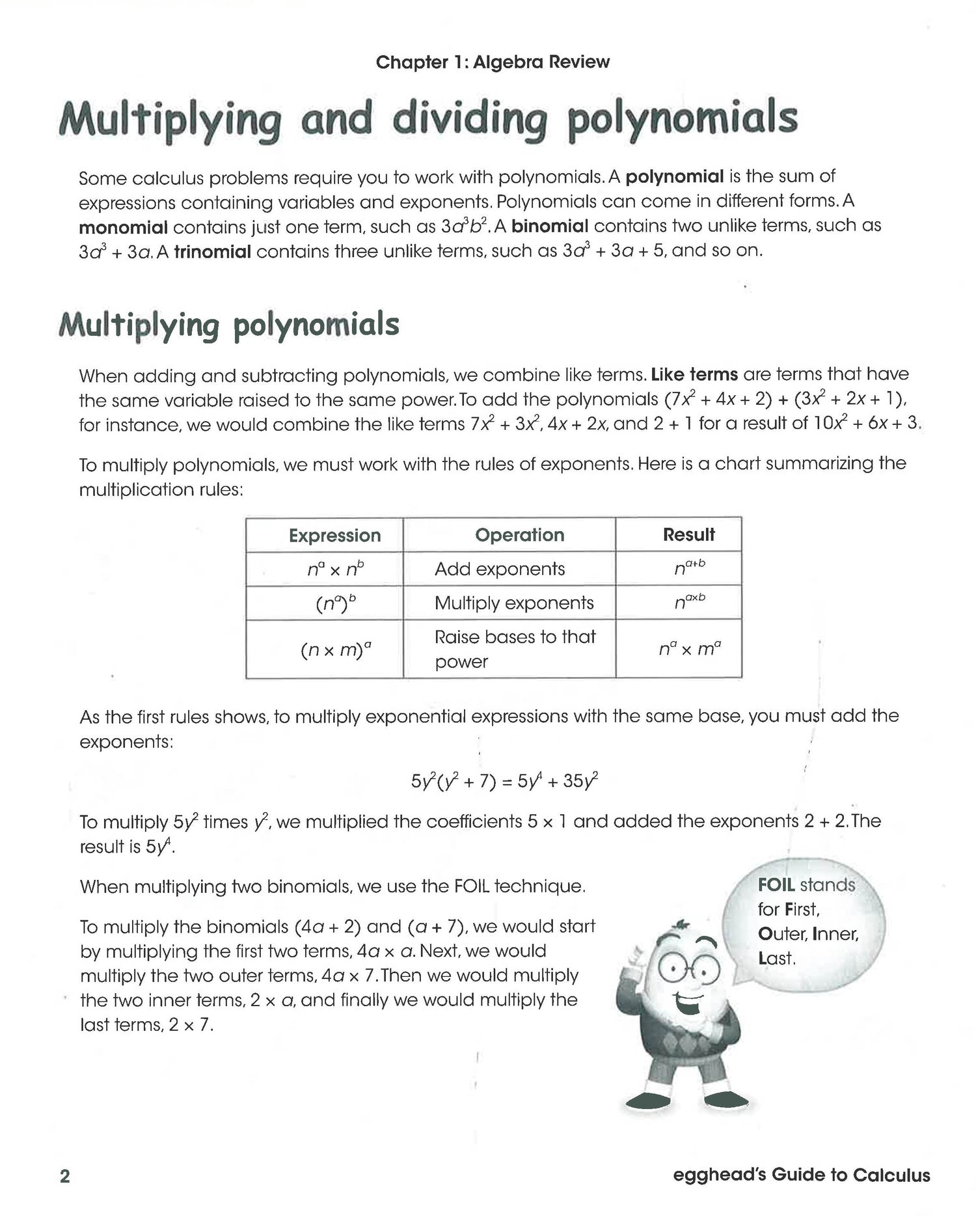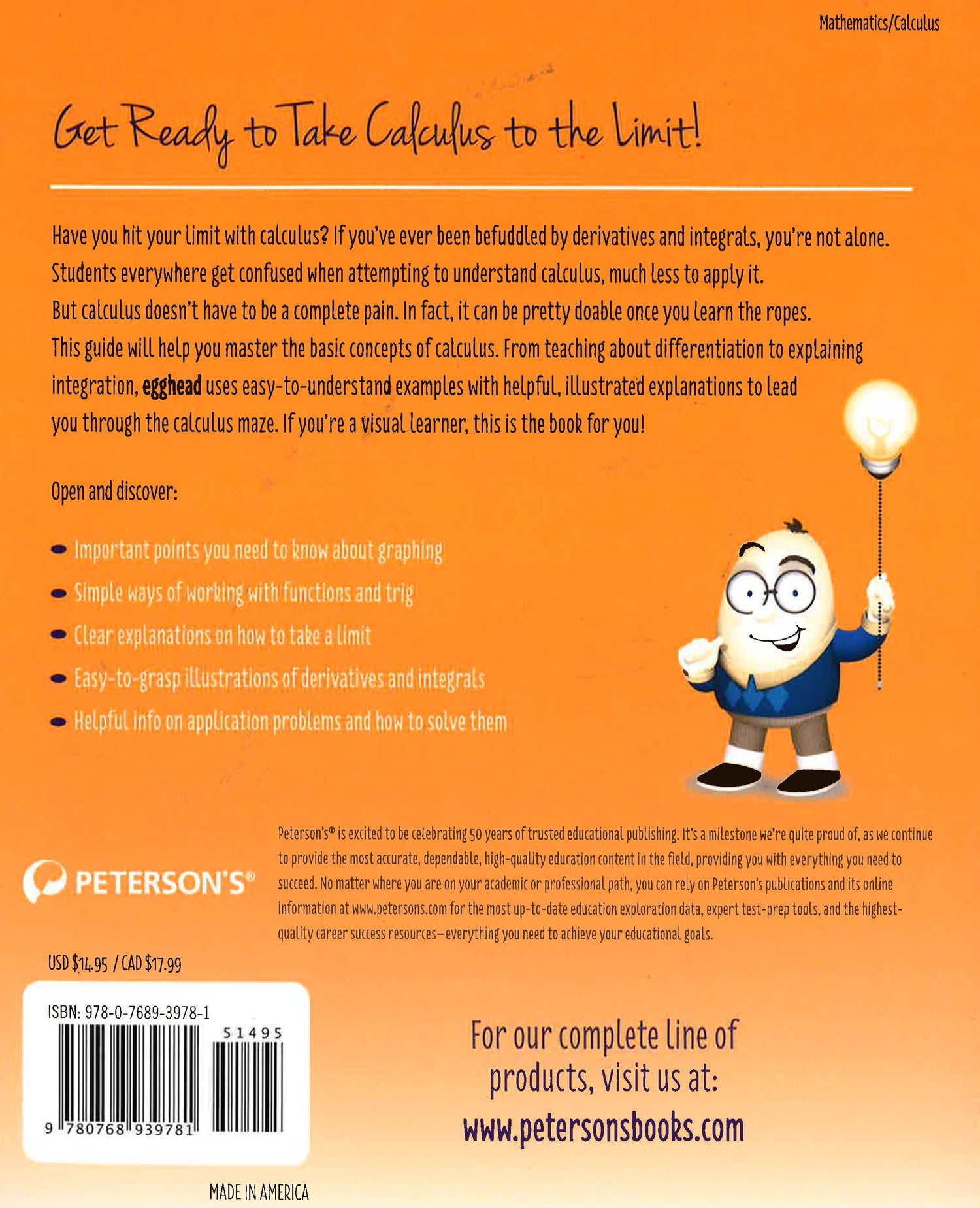 The fourth book in Peterson's NEW series of guides for visual learners, this volume covers basic calculus topics that are essential for success on high school and college calculus tests. Topics include limits & continuity, derivatives & their applications, and integrals. Students who need help with the basics will find that egghead's Guide to Calculus offers just what they need to be able to improve their understanding of the fundamentals of calculus necessary for success in high school and college courses. The book includes a review of algebra and trigonometry required in preparation for understanding calculus.