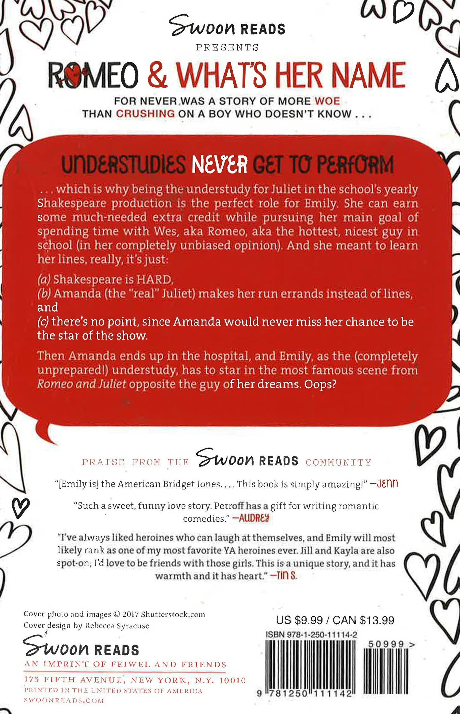 An unprepared understudy is forced to take the stage with her secret crush in Romeo & What's Her Name, a romantic YA comedy of errors from author Shani Petroff. Understudies never get to perform...which is why being Juliet's understudy in the school's yearly Shakespeare production is the perfect role for Emily. She can earn some much-needed extra credit while pursuing her main goal of spending time with Wes, aka Romeo, aka the hottest, nicest guy in school (in her completely unbiased opinion). And she meant to learn her lines, really, it's just: a) Shakespeare is HARD, b) Amanda (the "real" Juliet) makes her run errands instead of lines, and c) there's no point, since Amanda would never miss her chance to be the star of the show. Then Amanda ends up in the hospital and Emily, as the (completely unprepared!) understudy, has to star in the most famous scene from Romeo and Juliet opposite the guy of her dreams. Oops? Praise for Romeo and What's Her Name: "This has all the hallmarks of a high-school romance: a swoon-worthy male lead, a requisite mean girl, and plenty of backstage dallying and wacky miscommunication. Spunky Emily has great friends beside her, and it's this, even more than her budding romance with Wes, that makes this a worthwhile read. Flirty and fun." -- Booklist "Petroff's latest offering, published by Macmillan's crowdsourced imprint, will delight romance lovers with its fast pace and humorous tone. This sweet, lighthearted look at high school romantic foibles will be of particular interest to fans of books by Ann Brashares and Jennifer Echols." --School Library Journal "[Emily is] the American Bridget Jones...this book is simply amazing!" --Jenn, reader on SwoonReads.com "The characters, the pacing, the plot are all on point! Absolutely hilarious book!" --Sara, reader on SwoonReads.com "An amazing set up, authentic characters (who are definitely swoon worthy), and a dynamic storyline. What more could you want?" --Rain, reader on SwoonReads.com