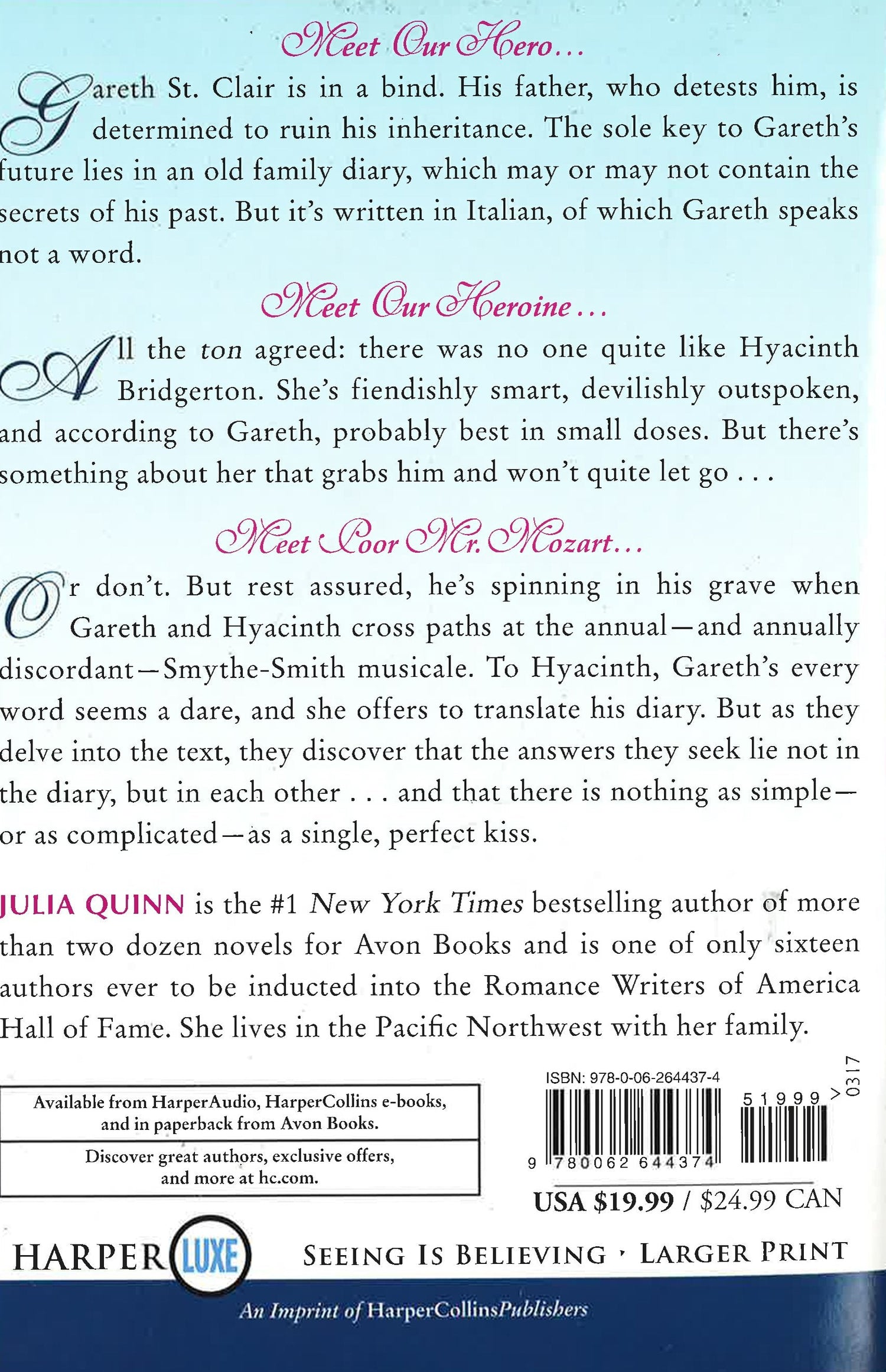 Gareth St. Clair is in a bind. His father, who detests him, is determined to beggar the St. Clair estates and ruin his inheritance. Gareth's sole bequest is an old family diary, which may or may not contain the secrets of his past . . . and the key to his future. The problem is - it's written in Italian, of which Gareth speaks not a word. All the ton agreed: there was no one quite like Hyacinth Bridgerton. She's fiendishly smart, devilishly outspoken, and according to Gareth, probably best in small doses. But there's something about her - something charming and vexing - that grabs him and won't quite let go . . .