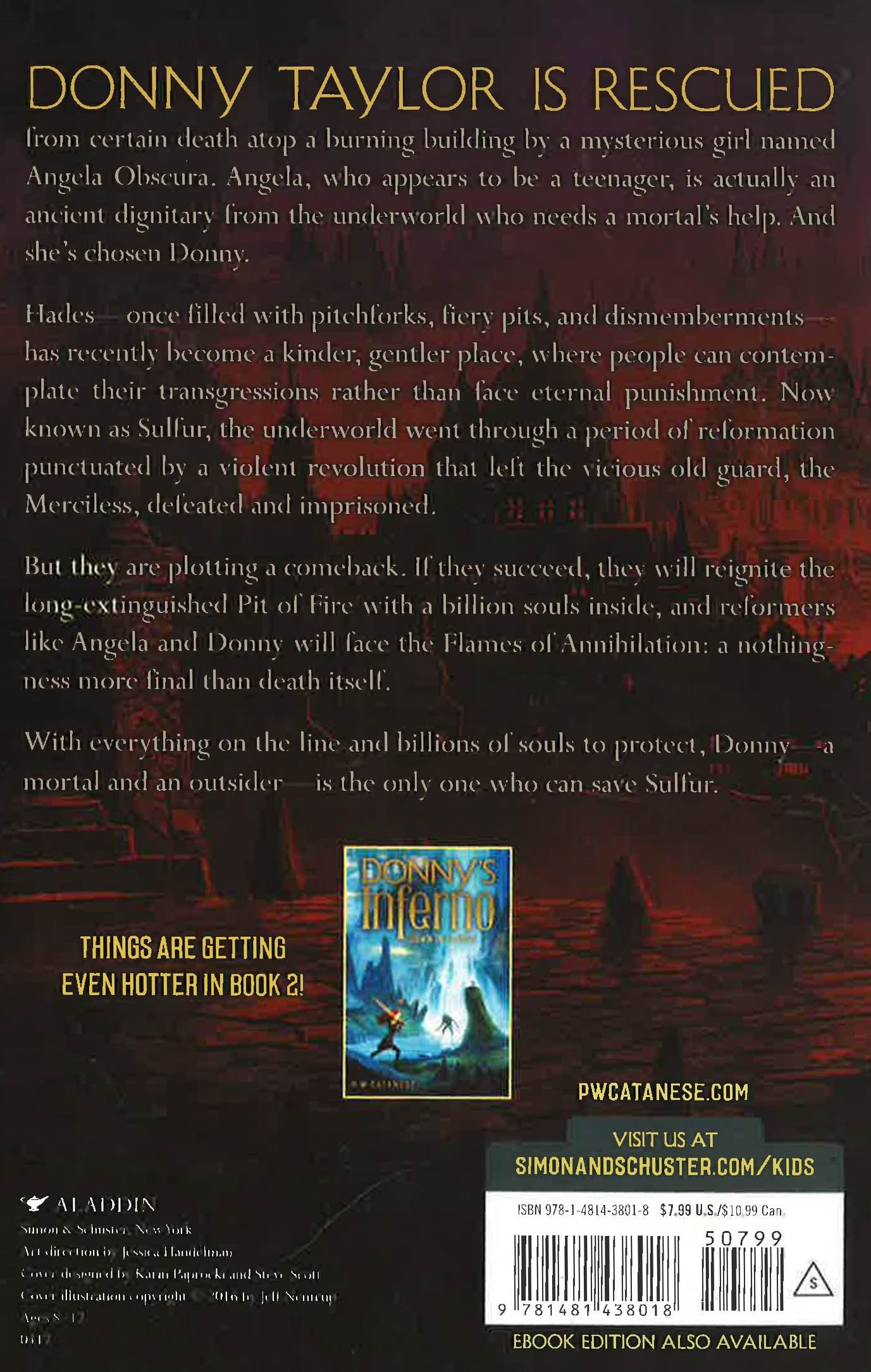 Twelve-year-old Donny Taylor was rescued from certain death in a burning building. His savior, a mysterious girl named Angela Obscura, seems to be able to walk right out of the flames. Although she appears to be a teenager, Angela is actually an ancient dignitary from the underworld who needs the help of a mortal. And she’s chosen Donny.Hades, a bizarre, cavernous world that was once filled with pitchforks, fiery pits, and tortured souls, has recently become a kinder, gentler place where people can contemplate their transgressions rather than face eternal punishment. Now known as Sulfur, the underworld went through a period of reformation punctuated by a violent revolution that left the vicious old guard, the Merciless, defeated and imprisoned.But it soon becomes apparent that the Merciless are plotting a comeback. If they succeed, they will reignite the long-extinguished Pits of Fire with a billion souls inside. And reformers like Angela and Donny will face Annihilation: the utter destruction of the consciousness and the soul, a nothingness more final than death itself.With everything on the line and billions of souls to protect, Donny - a mortal and outsider - becomes the key to the underworld’s salvation and the only one who can save Sulfur.