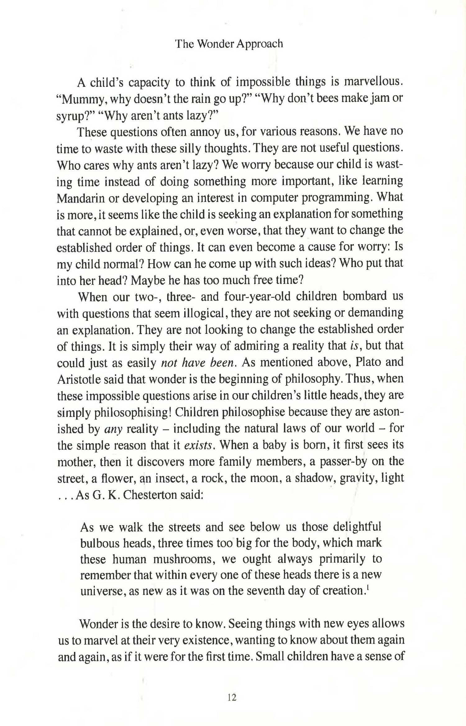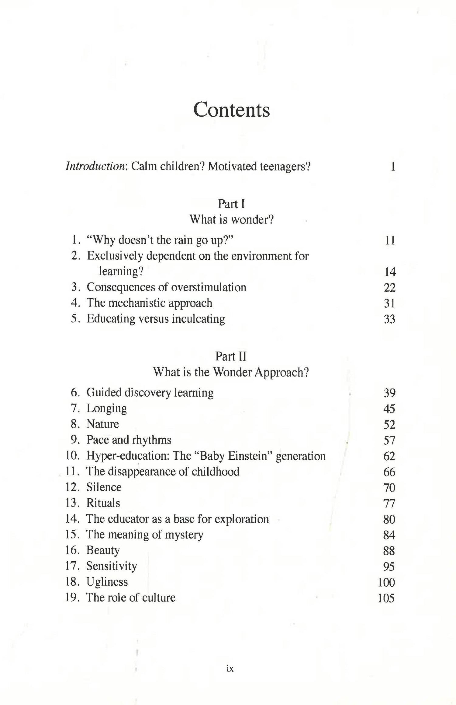 Children of the last twenty years have grown up in an increasingly frenzied and demanding environment so that, on one hand, education has been rendered more complicated, and on the other, the essentials have been lost to view. In order to ensure their future success, parents often feel that they must fill their children's schedules with endless activities that cause leisure, spontaneous activity, and the experience of nature, beauty and silence, to fade out of their lives.