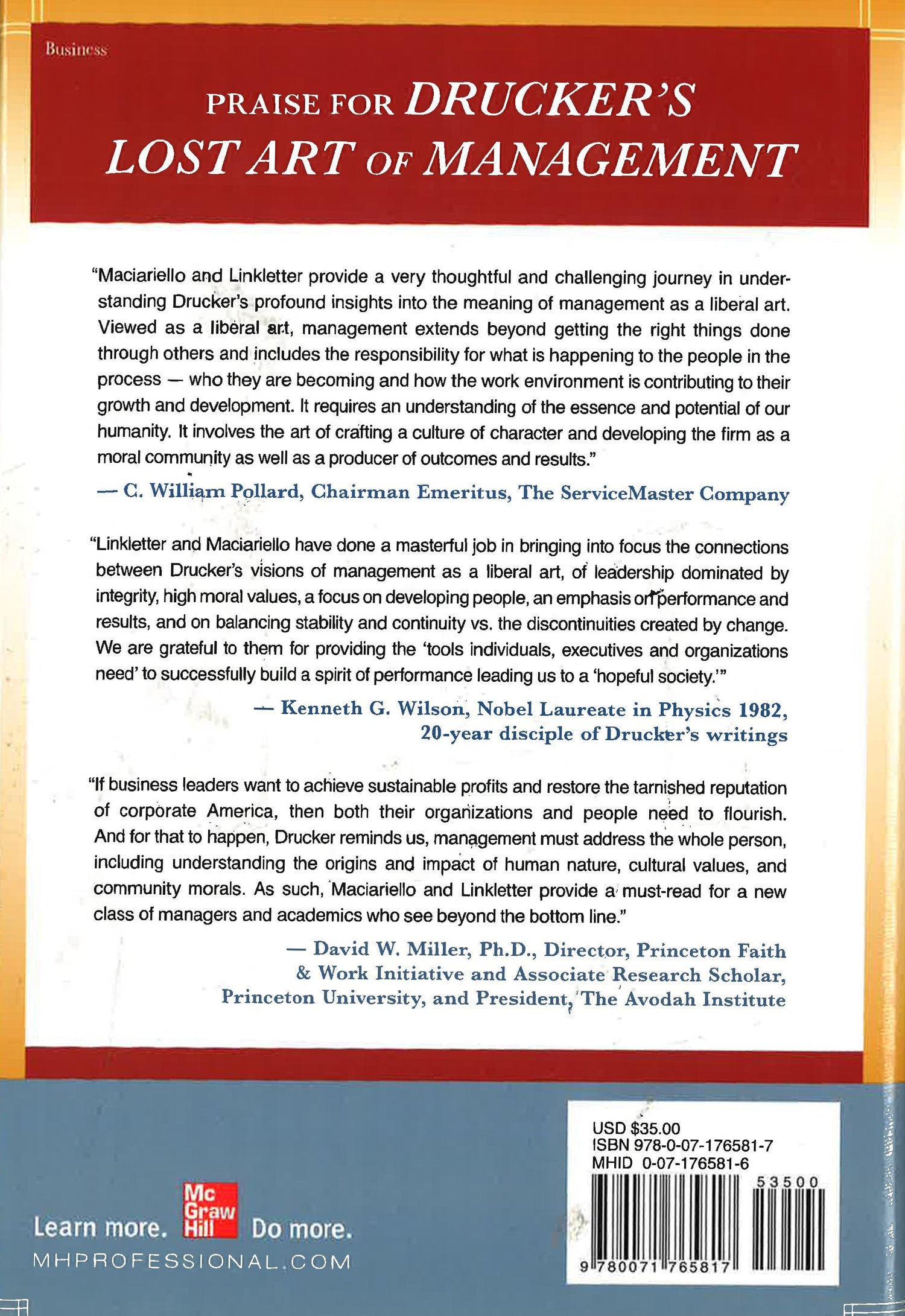 For Drucker, management was a moral force, not merely a tool at the service of the amoral market . . ."Maciariello and Linkletter provide a very thoughtful and challenging journey in understanding Drucker's profound insights into the meaning of management as a liberal art."-C. William Pollard, Chairman Emeritus, The ServiceMaster Company"Linkletter and Maciariello have done a masterful job in bringing into focus the connections between Drucker's visions of management as a liberal art, of leadership dominated by integrity, high moral values, a focus on developing people, an emphasis on performance and results, and on balancing stability and continuity vs. the discontinuities created by change."-Kenneth G. Wilson, Nobel Laureate in Physics 1982, 20-year disciple of Drucker's writings"Maciariello and Linkletter provide a must-read for a new class of managers and academics who see beyond the bottom line."-David W. Miller, Ph.D., Director Princeton Faith & Work Initiative and Associate Research Scholar, Princeton University, and President, The Avodah InstituteAbout the Book:While corporate malfeasance was once considered the exception, the American public is increasingly viewing unethical, immoral, and even criminal business behavior as the norm. According to the authors of Drucker's Lost Art of Management, there is some truth behind this new perception. Business management has lost its bearings, and the authors look to Peter Drucker's vision of management as a liberal art to steer business back on course.Recognized as the world's leading Drucker scholar, Joseph Maciariello, along with fellow Drucker scholar Karen Linkletter, provides a blueprint for making corporate American management more functional and redeeming its reputation. Throughout his career, Peter Drucker made clear connections between the liberal arts and effective management, but he passed away before providing a detailed exposition of his ideas. Maciariello and Linkletter integrate their Drucker expertise in management and the liberal arts to finally define management as a liberal art and fulfill Drucker's vision.In Drucker's Lost Art of Management, Maciariello and Linkletter examine Drucker's contention that managers must concern themselves with the foundational concepts of political science, history, economic theory, and other liberal arts, such as:Societal values and standardsThe use and abuse of powerIndividual character developmentInnovation and technologyThe nature of good and evilThe role managers play in a healthy societyThe authors create a new philosophy of management based on the principles leaders throughout history have relied on to be effective both individually and as custodians of civilized society and healthy economies.Our future executives, professionals, managers, and entrepreneurs are on track to learning (and perpetuating) the idea that only the bottom line matters in business--a concept that benefits no one in the end. It's up to us to instill the ageless verities that make for good management, good society, and good business results.A passionate call for radical change in today's management practices, Drucker's Lost Art of Management provides the ideas, concepts, and practical advice to make that change happen before it's too late.