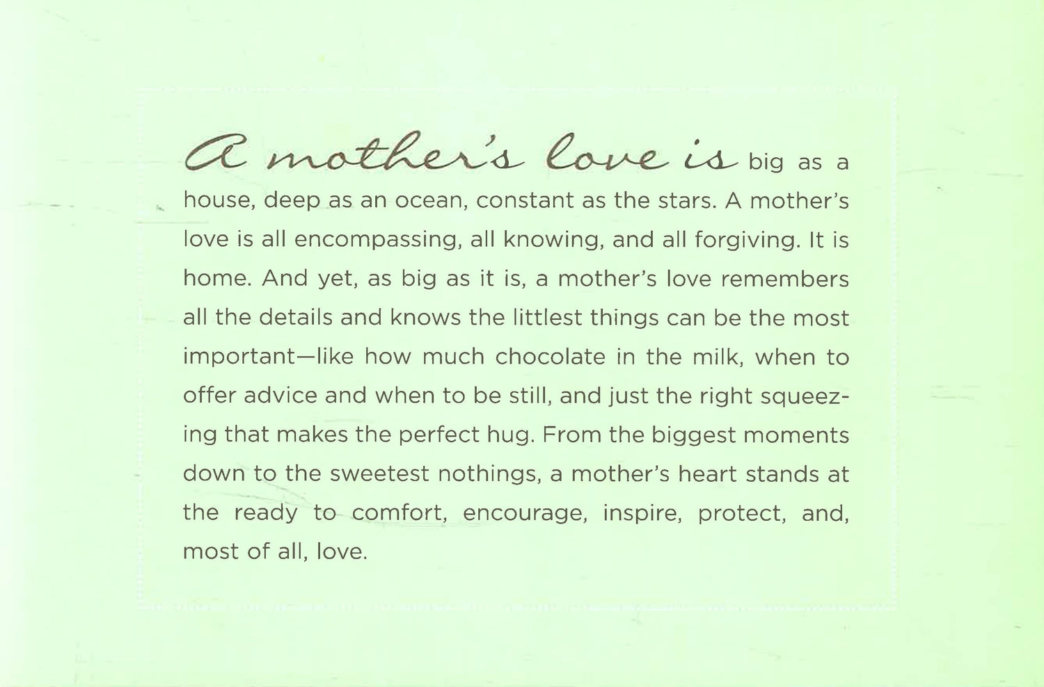 Mina Parker has demonstrated her innate flair for unique and exquisite gift books with titles such as Mother Is a Verb, Her Inspiration, 100 Good Wishes for Baby, 100 Sweet Nothings for Baby, Half Full, and Silver Linings. Well, she's done it again with this lovely homage to mothers everywhere. A wealth of inspiring quotes from quarters as diverse as African proverbs and Sophia Loren, Washington Irving and Erma Bombeck, Erica Jong, Oprah Winfrey, and Honore Balzac are paired with single sentences in praise of a mother's love.