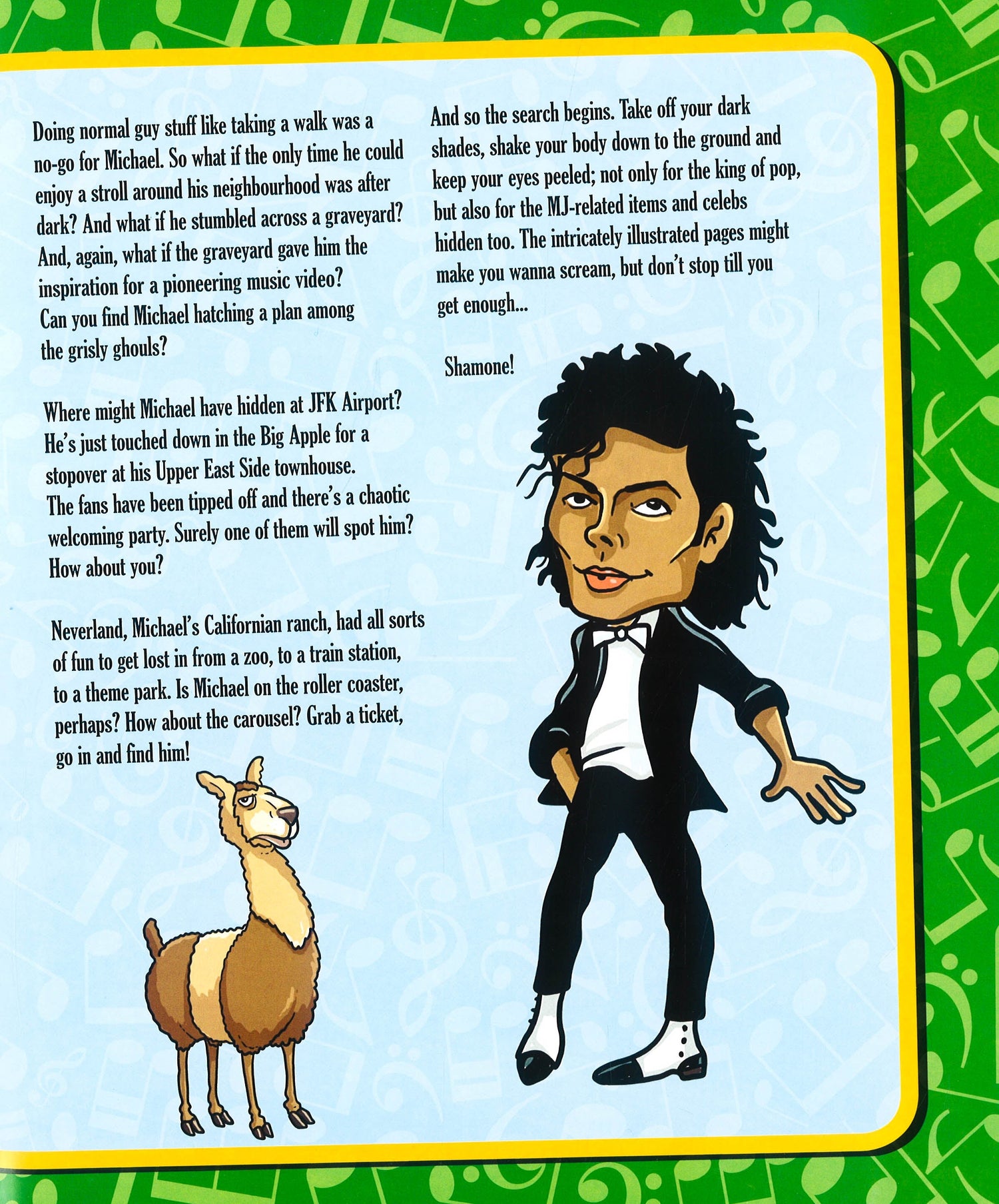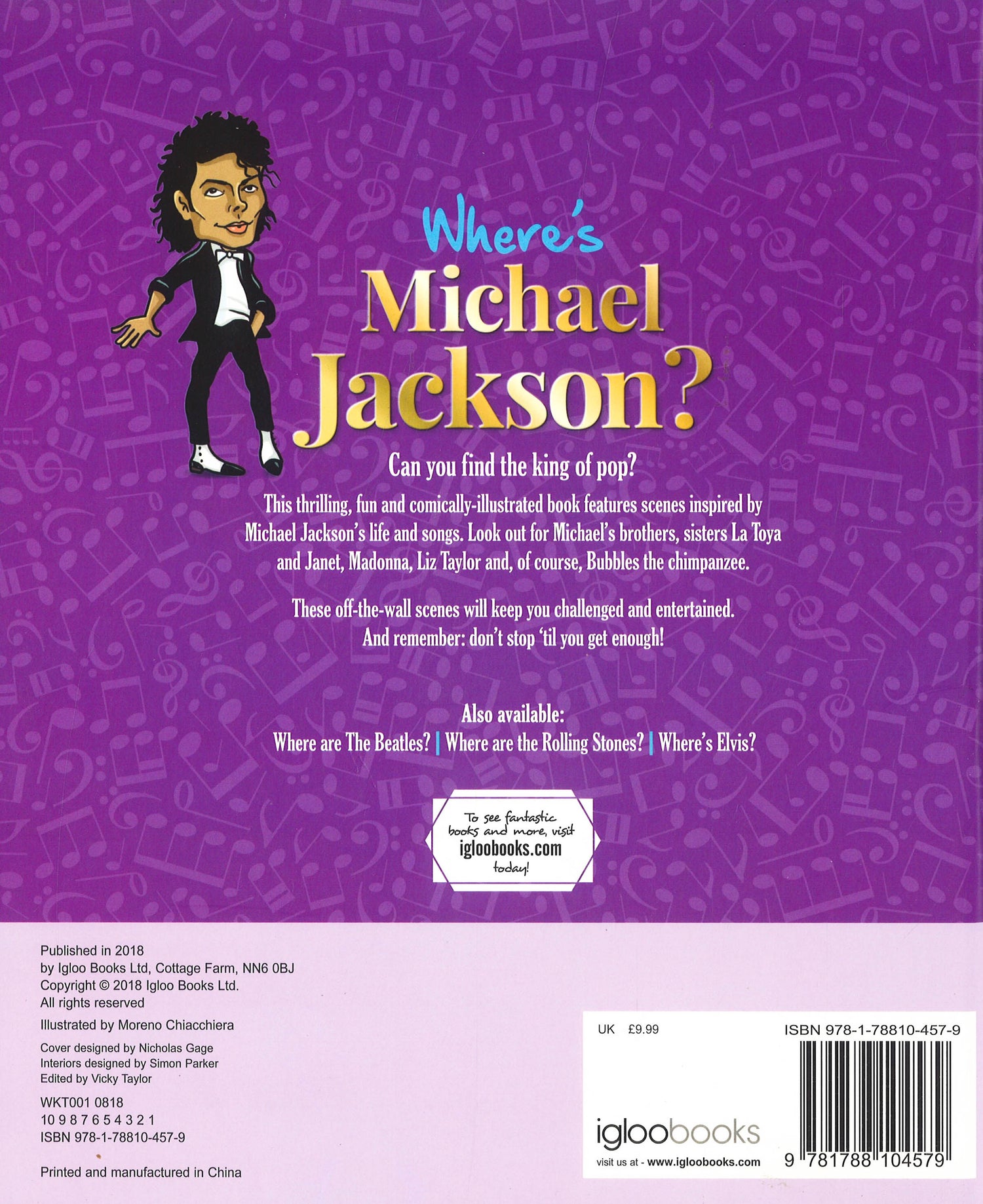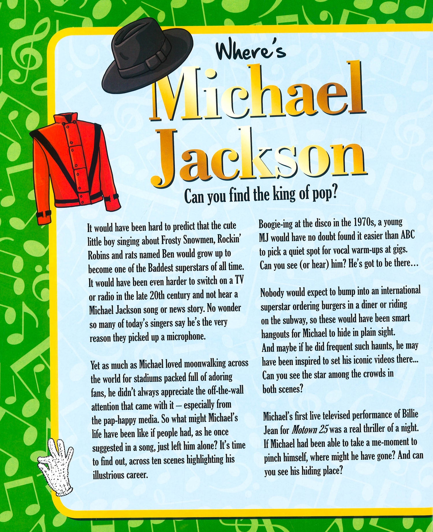 This thrilling, fun and comically-illustrated book features scenes inspired by Michael Jackson's life and songs. Look out for Michael's brothers, sisters La Toya and Janet, Madonna, Liz Taylor and, of course, Bubbles the chimpanzee. These off-the-wall scenes will keep you challenged and entertained. And remember: don't stop `til you get enough!