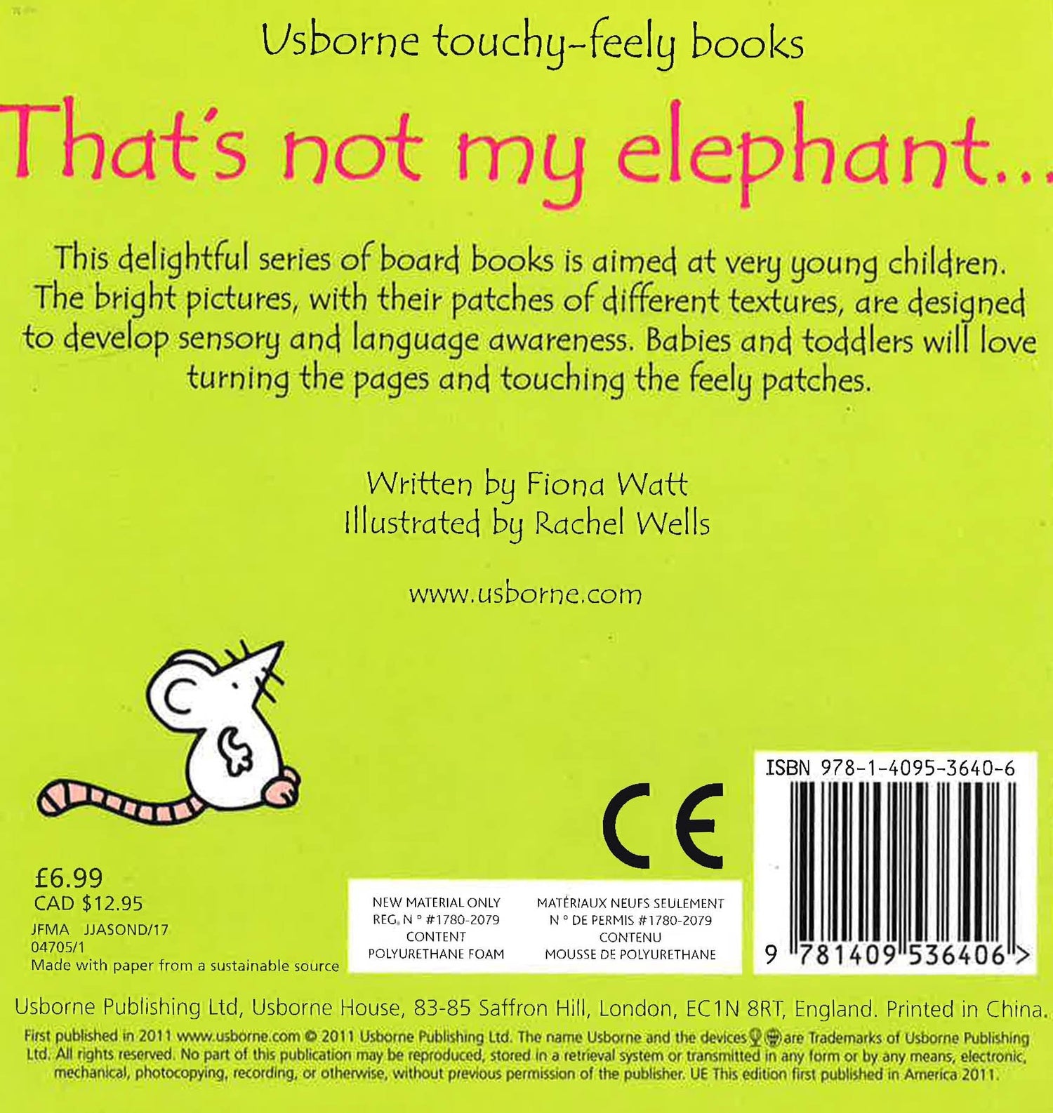 A touchy-feely board book with simple, repetitive text, tactile patches and bold illustrations suitable for babies and toddlers. A little, white mouse appears on every page, for children to spot.