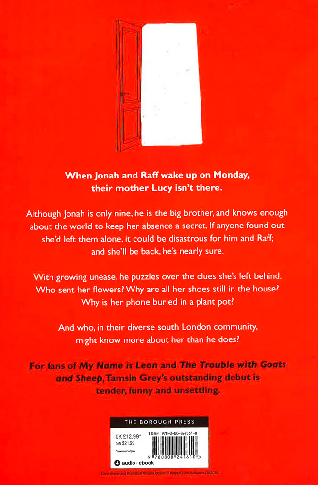 When Jonah and Raff wake up on Monday, their mother Lucy isn't there.When Jonah and Raff wake up on Monday, their mother Lucy isn't there. Although Jonah is only nine, he is the big brother, and knows enough about the world to keep her absence a secret. If anyone found out she'd left them alone, it could be disastrous for him and Raff; and she'll be back, he's nearly sure. With growing unease, he puzzles over the clues she's left behind. Who sent her the flowers? Why are all her shoes still in the house? Why is her phone buried in a plant pot? And who, in their diverse south London community, might know more about her than he does?For fans of My Name is Leon and The Trouble with Goats and Sheep, Tamsin Grey's outstanding debut is tender, funny and unsettling.