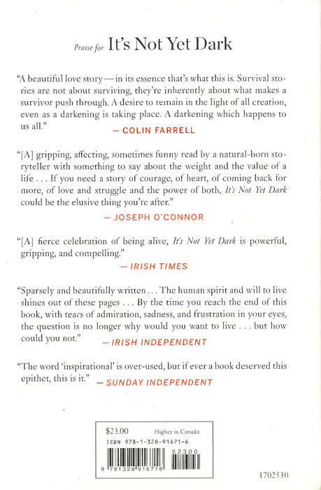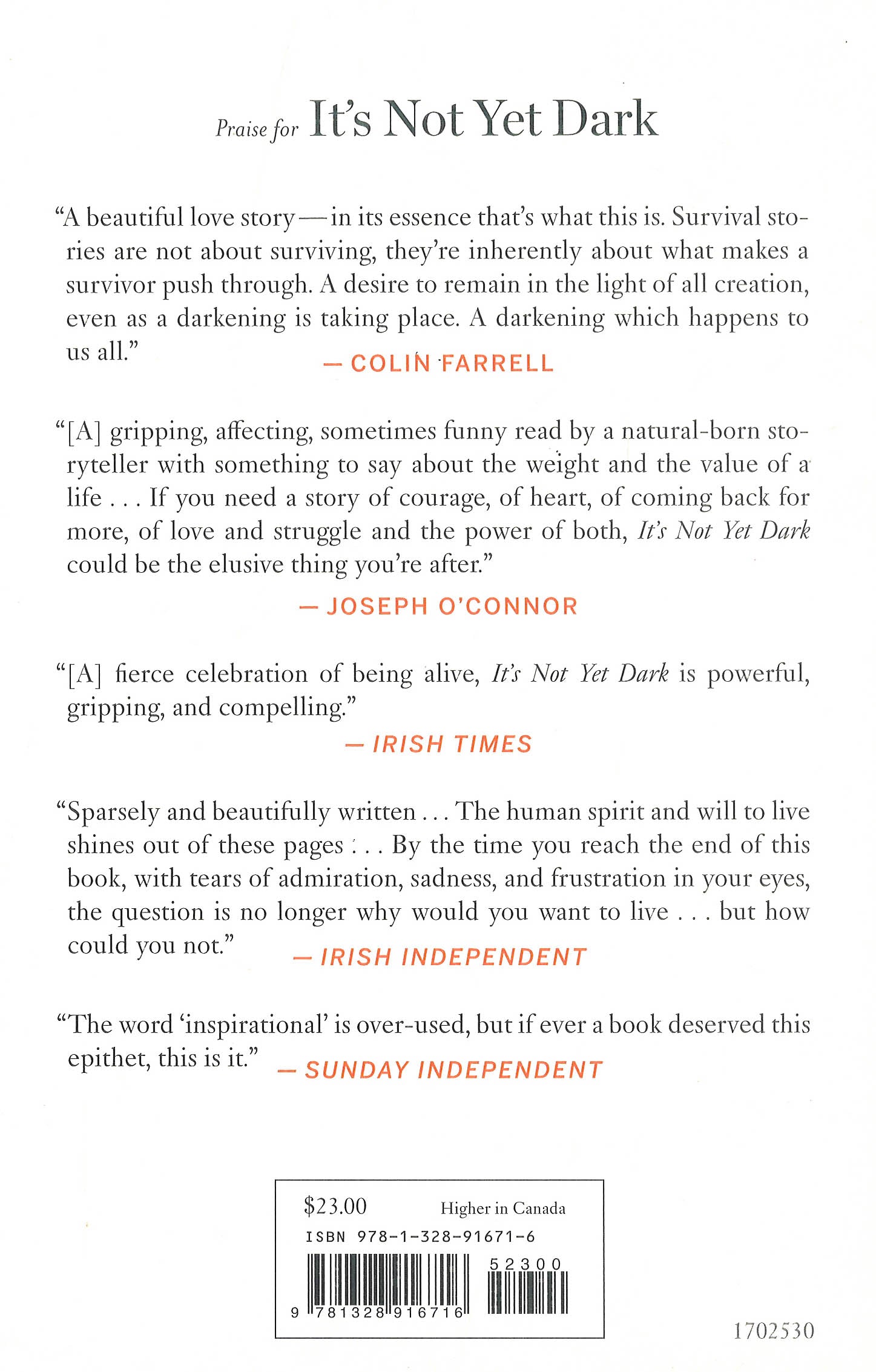 "A fiercely eloquent testament to making the most out of every moment we're given."--People, Book of the WeekA luminous memoir in the tradition of The Diving Bell and the Butterfly and a #1 bestseller upon its initial release in Ireland, a young filmmaker gives us "a story of courage, of heart, of coming back for more, of love and struggle and the power of both" (Joseph O'Connor).In 2008, Simon Fitzmaurice was diagnosed with ALS, or Lou Gehrig's disease. He was given four years to live. In 2010, in a state of lung-function collapse, Simon knew with crystal clarity that now was not his time to die. Against all prevailing medical opinion, he chose to ventilate in order to stay alive.In It's Not Yet Dark, the young filmmaker, a husband and father of five small children, draws us deeply into his inner world. Told in simply expressed and beautifully stark prose, it is an astonishing journey into a life that, though brutally compromised, is lived more fully than most, revealing at its core the potent power love has to carry us through the days.Written using an eye-gaze computer, It's Not Yet Dark is an unforgettable book about relationships and family, about what connects and separates us as people, and, ultimately, about what it means to be alive.