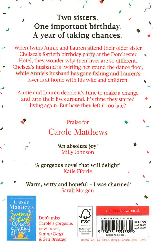 When twins Annie and Lauren attend their older sister Chelsea's 40th birthday party at the Dorchester Hotel, they wonder why their lives are so different. Chelsea's husband is twirling her round the dance floor, while Annie's husband has gone fishing and Lauren's lover is at home with his wife and children. Annie and Lauren decide it's time to make a change and turn their lives around, it's time they starting living again. But have they left it too late?