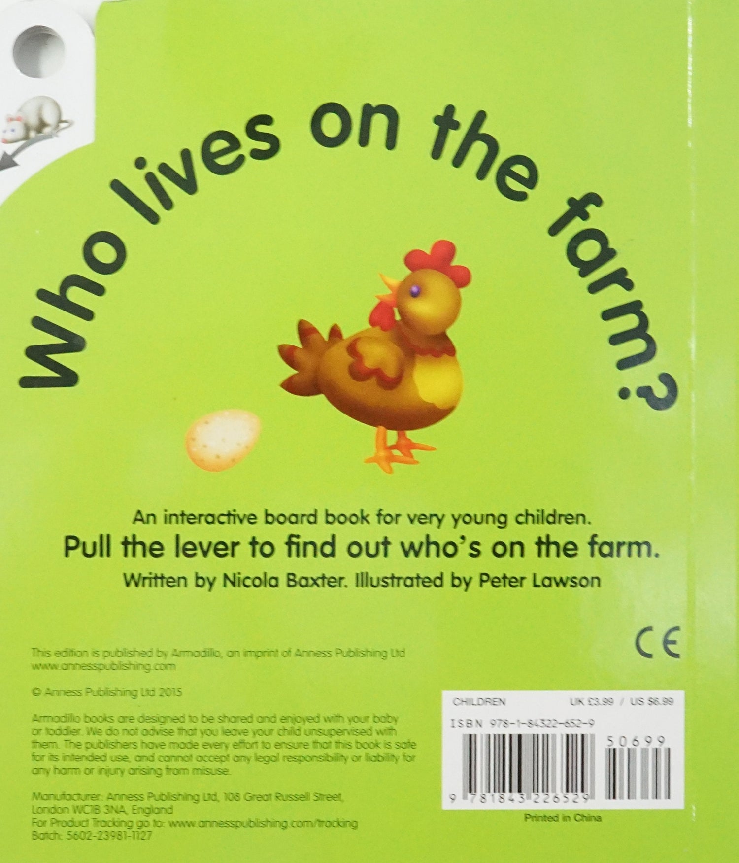 This is an illustrated, interactive pull-the-lever board book for very young children. Children will love seeing the images pop up in this fun question-and-answer board book! Every page asks a simple question, and a special lever reveals the answer in a pop-up picture. Other titles in this series include "Who Says Moo?" "Who's Hiding?" and "Who Lives Here?" Flip the lever to find out who is making a noise in the henhouse, who is munching in the meadow, who is paddling in the pond and who's playing in a puddle in this interactive storybook. Little hands will love pulling the sturdy levers and finding out who's who on the farm, while the friendly farmyard characters in this book will delight your child as you read together. This engaging book, printed on thick board pages, is full of bright, bold illustrations and brings early learning concepts to preschool children.