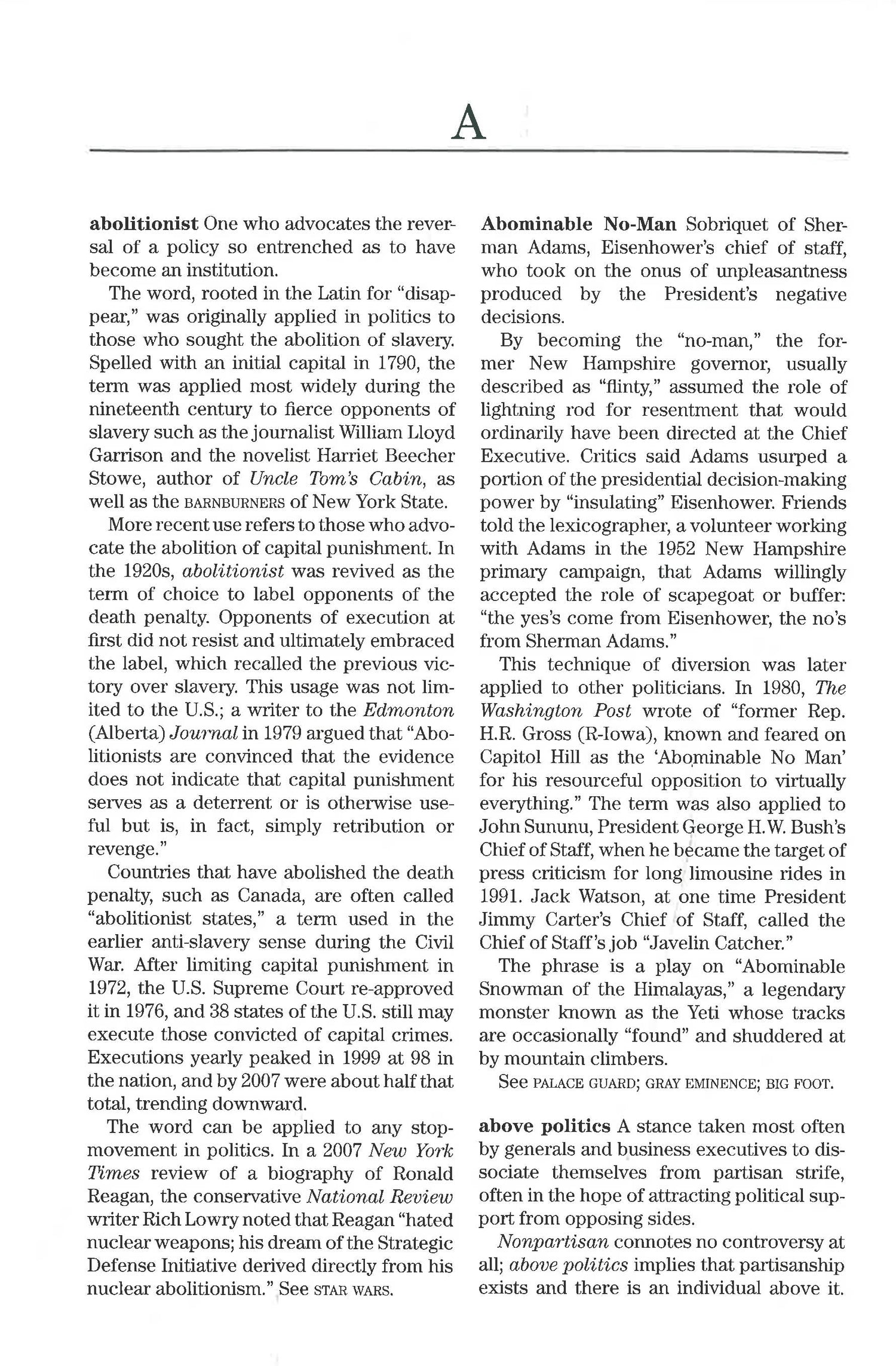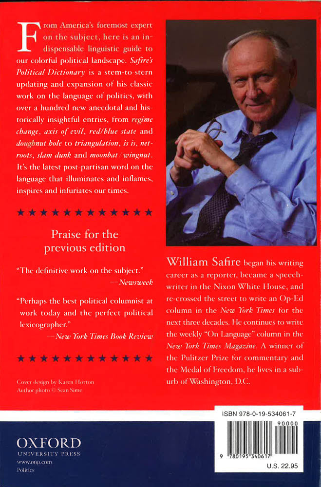 When it comes to the vagaries of language in American politics, its uses and abuses, its absurdities and ever-shifting nuances, its power to confound, obscure, and occasionally to inspire, William Safire is the language maven we most readily turn to for clarity, guidance, and penetrating, sometimes lacerating, wit. Safire's Political Dictionary is a stem-to-stern updating and expansion of the Language of Politics, which was first published in 1968 and last revised in 1993, long before such terms as Hanging Chads, 9/11 and the War on Terror became part of our everyday vocabulary. Nearly every entry in that renowned work has been revised and updated and scores of completely new entries have been added to produce an indispensable guide to the political language being used and abused in America today. Safire's definitions-discursive, historically aware, and often anecdotal-bring a savvy perspective to our colorful political lingo. Indeed, a Safire definition often reads like a mini-essay in political history, and readers will come away not only with a fuller understanding of particular words but also a richer knowledge of how politics works, and fails to work, in America. From Axis of Evil, Blame Game, Bridge to Nowhere, Triangulation, and Compassionate Conservatism to Islamofascism, Netroots, Earmark, Wingnuts and Moonbats, Slam Dunk, Doughnut Hole, and many others, this language maven explains the origin of each term, how and by whom and for what purposes it has been used or twisted, as well as its perceived and real significance. For anyone who wants to cut through the verbal haze that surrounds so much of American political discourse, Safire's Political Dictionary offers a work of scholarship, wit, insiderhood and resolute bipartisanship.