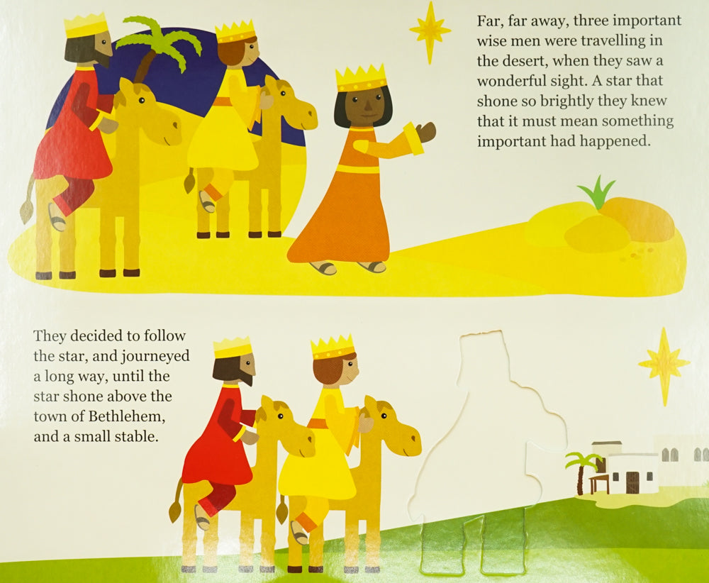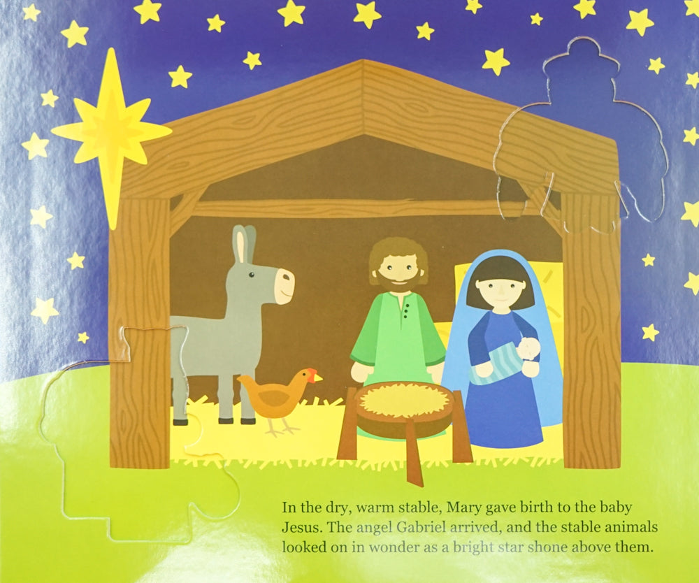 Includes puzzle pieces to find and match to the right spaces on the book pages. With a fold-out manger scene and stand-alone, easy-to-assemble play pieces so that children can create their own Nativity scene.