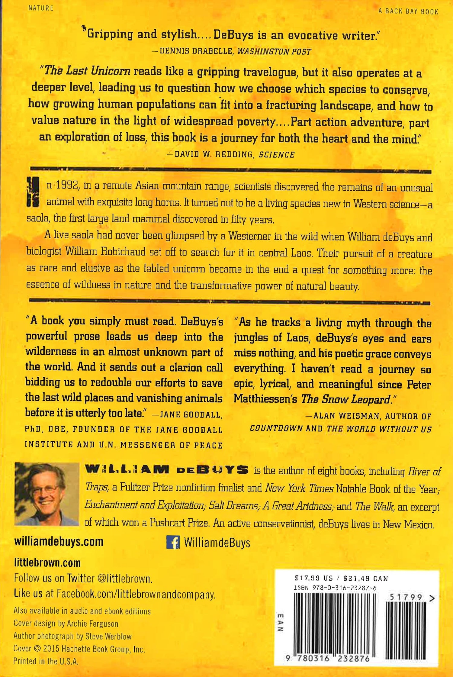 An award-winning author's quest to find and understand a creature as rare and enigmatic as any on Earth In 1992, in a remote mountain range, a team of scientists discovered the remains of an unusual animal with exquisite long horns. It turned out to be a living species new to Western science--a saola, the first large land mammal discovered in fifty years. Rare then and rarer now, a live saola had never been glimpsed by a Westerner in the wild when Pulitzer Prize finalist and nature writer William deBuys and conservation biologist William Robichaud set off to search for it in central Laos. Their team endured a punishing trek up and down white-water rivers and through mountainous terrain ribboned with the snare lines of armed poachers who roamed the forest, stripping it of wildlife. In the tradition of Bruce Chatwin, Colin Thubron, and Peter Matthiessen, The Last Unicorn chronicles deBuys's journey deep into one of the world's most remote places. It's a story rich with the joys and sorrows of an expedition into undiscovered country, pursuing a species as rare and elusive as the fabled unicorn. As is true with the quest for the unicorn, in the end the expedition becomes a search for something more: the essence of wildness in nature, evidence that the soul of a place can endure, and the transformative power of natural beauty.