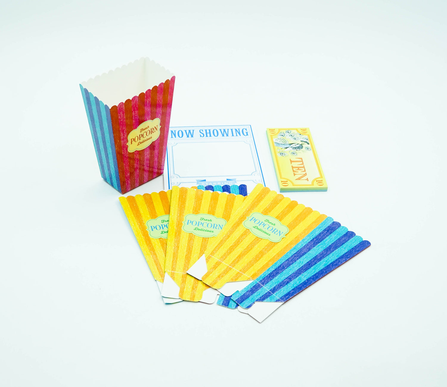 Includes 4 show posters, stage door, and box office sign, 90 tickets, popcorn boxes, programs, microphone and bouquet, and play money