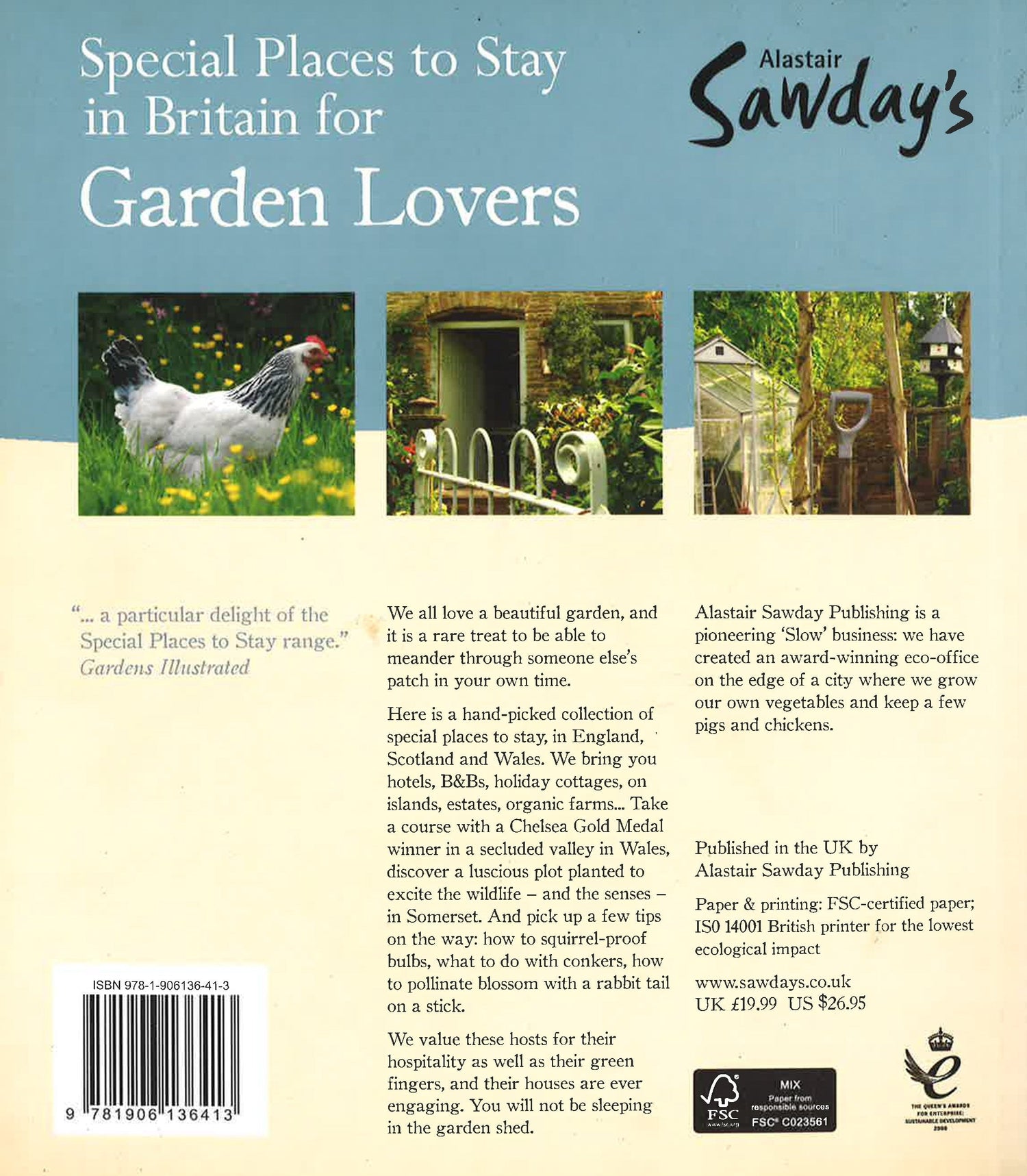 A hand-picked collection Special Places to Stay all with fabulous gardens for you to explore. Stay on the remote Isle of Gigha where the owner grows rare tropical orchids; take a course with Chelsea Gold Medal winner or pop next door to the National Botanic Garden Wales after a night on an organic farm. There are 90 places in all; B&Bs, self-catering cottages and hotels our most diverse collection of gardens to date. You ll find great value too with over a third with double rooms for 70 or less a night. All are visited by us and chosen because we like them- hosts are valued for their hospitality as much as their green-fingers and places for their character and setting."