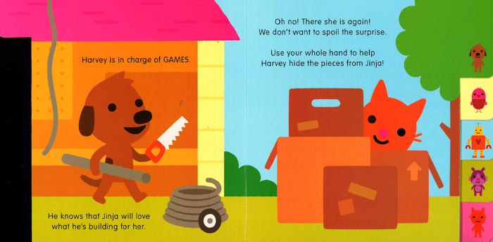 Use your whole hand to help Harvey hide the pieces from Jinja! The Sago Mini friends are throwing a surprise party for JInja and they need the reader's help to keep it a surprise. In this interactiave tabbed board book, each big, bold tab will feature a different friend, bringing readers straight into each surprise item for Jinja.