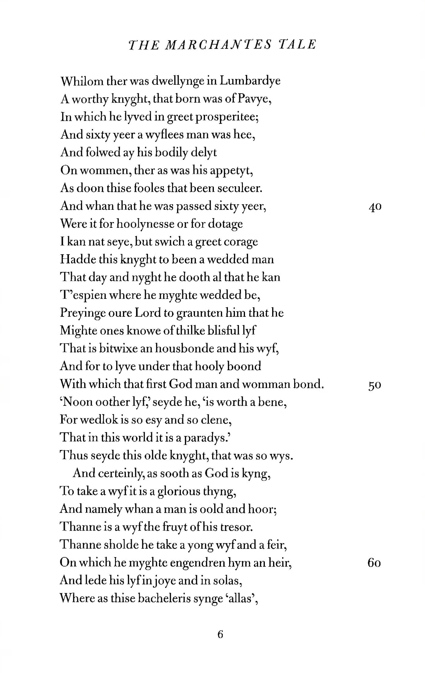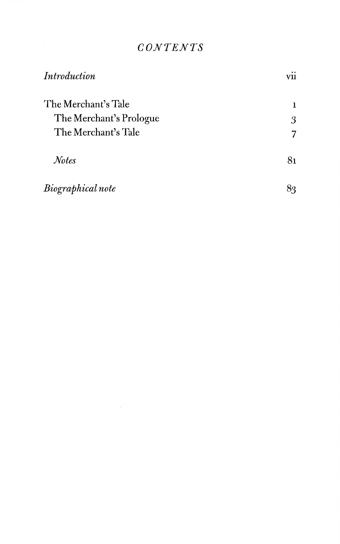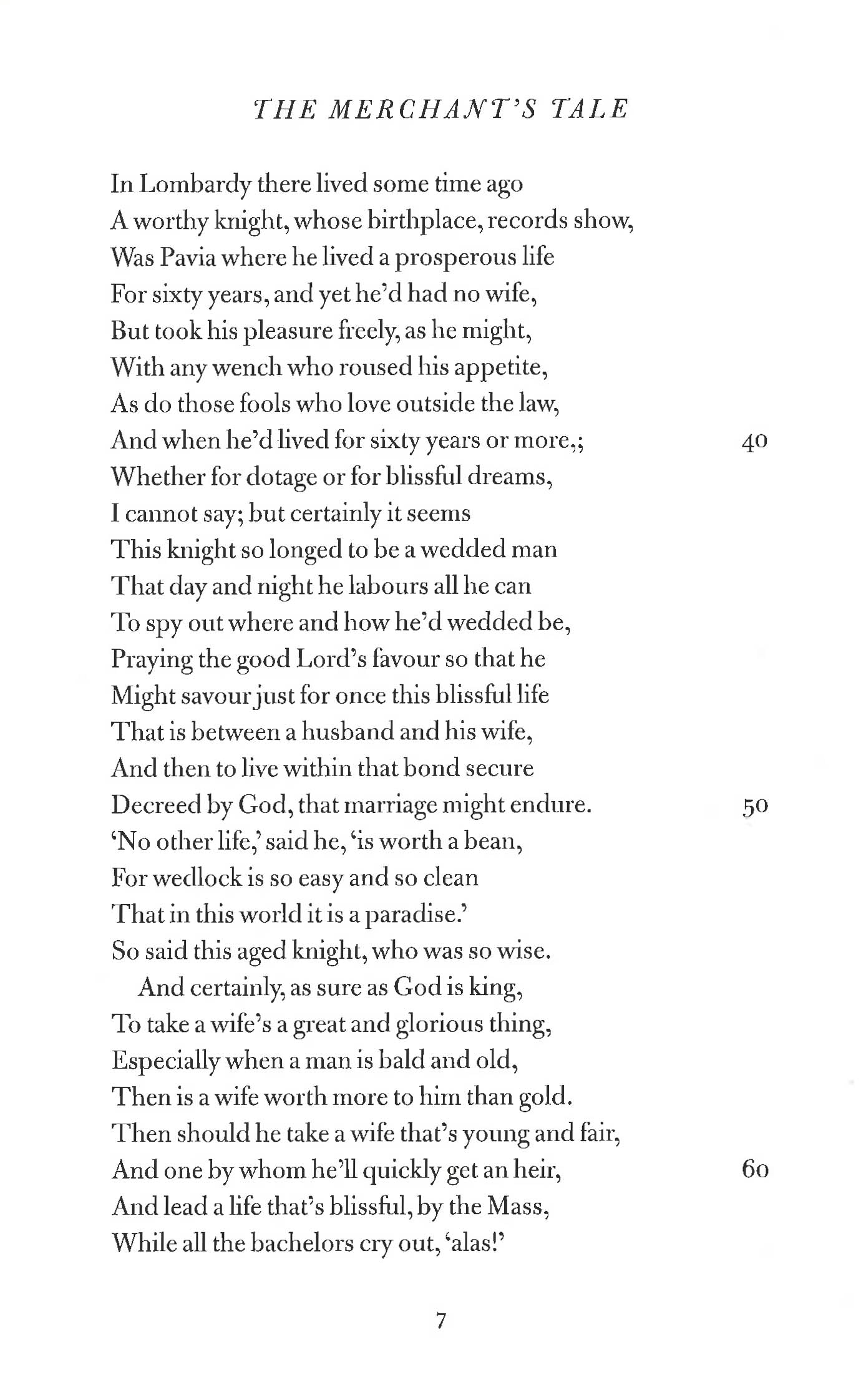 In the face of vociferous protestations from his friends, age-withered January selects a radiant young wife. His beloved--innocence embodied, to the untrained eye--wastes little time acquainting herself with his servants. Taking advantage of her husband's blindness, she explores her carnal appetite with his footman, with little regard for dignity. Chaucer's genius is to elevate her transgression to the level of gender politics; as deities intervene to decide the plight of future man and woman, the full import of January and May's relationship is revealed.