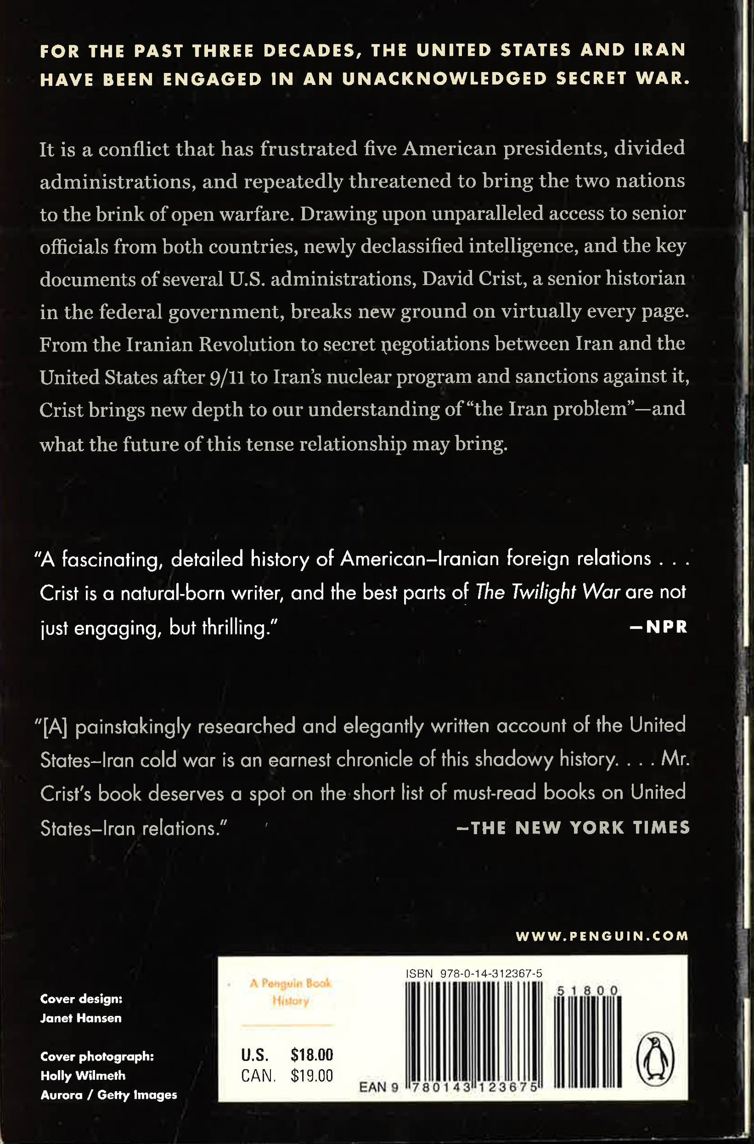 The United States and Iran have been engaged in an unacknowledged secret war since the 1970s. This conflict has frustrated multiple American presidents, divided administrations, and repeatedly threatened to bring the two nations to the brink of open warfare. Drawing upon unparalleled access to senior officials and key documents of several U.S. administrations, David Crist, a senior historian in the federal government, breaks new ground on virtually every page of The Twilight War. From the Iranian Revolution to secret negotiations between Iran and the United States after 9/11, from Iran's nuclear program to the secretive and deadly role of Qasem Soleimani, Crist brings vital new depth to our understanding of "the Iran problem"--and what the future of this tense relationship may bring.