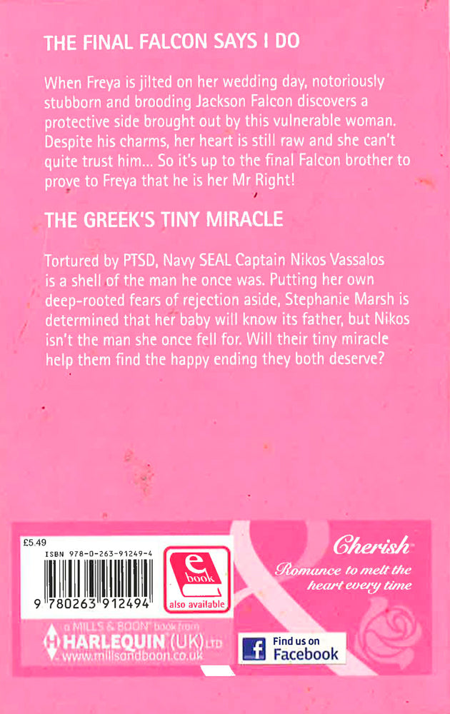 The Final Falcon Says I Do When Freya is jilted on her wedding day, notoriously stubborn and brooding Jackson Falcon discovers a protective side brought out by this vulnerable woman. Despite his charms, her heart is still raw and she can't quite trust him... So it's up to the final Falcon brother to prove to Freya that he is her Mr Right! The Final Falcon Says I Do When Freya is jilted on her wedding day, notoriously stubborn and brooding Jackson Falcon discovers a protective side brought out by this vulnerable woman. Despite his charms, her heart is still raw and she can't quite trust him... So it's up to the final Falcon brother to prove to Freya that he is her Mr Right! The Greek's Tiny Miracle Tortured by PTSD, Navy SEAL Captain Nikos Vassalos is a shell of the man he once was. Putting her own deep-rooted fears of rejection aside, Stephanie Marsh is determined that her baby will know its father, but Nikos isn't the man she once fell for. Will their tiny miracle help them find the happy ending they both deserve?